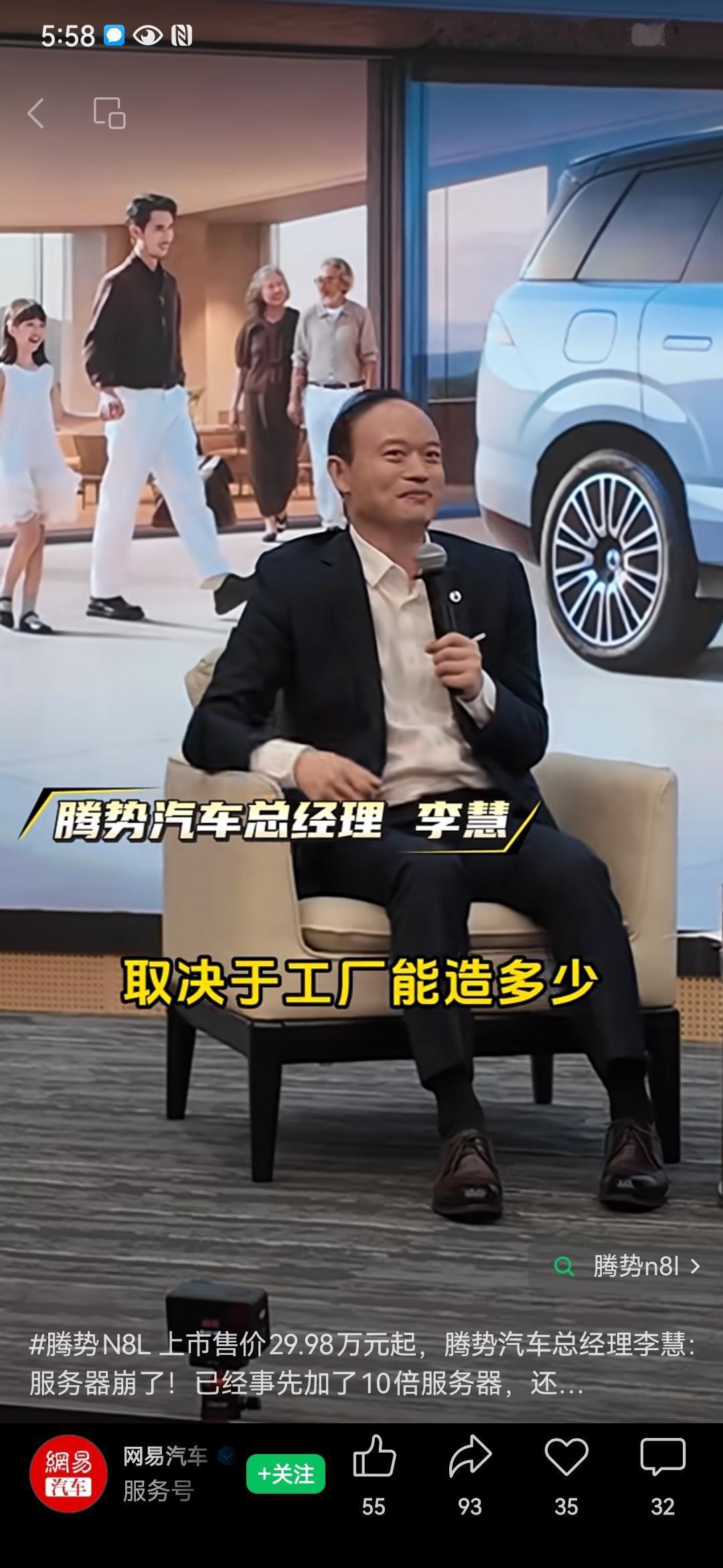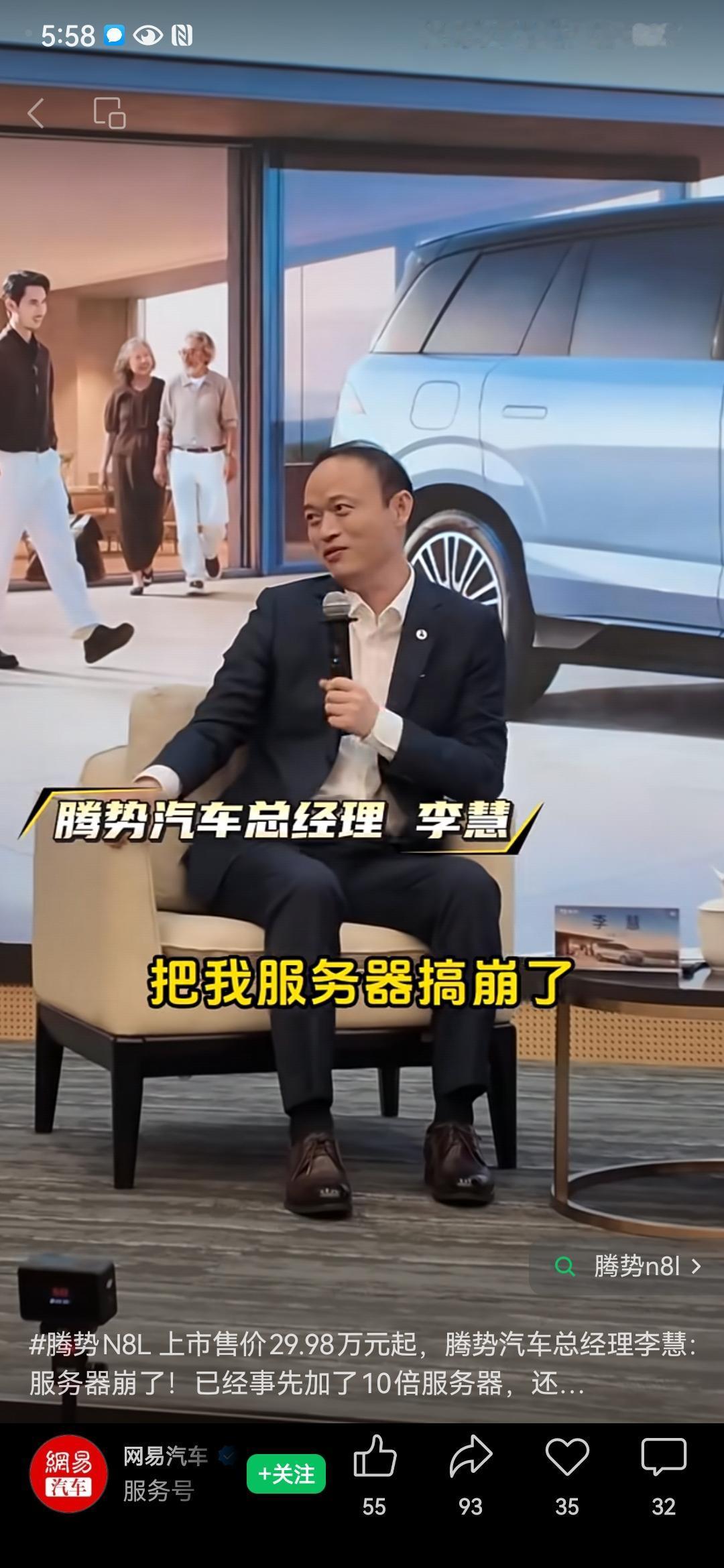 想不到新上市的腾势n8l这么火爆,提前加了十倍的服务器都不够用,汹涌的订单还是把服务器搞崩了,早知如此,应该加到30倍,50倍,而且慧总表示,能交付多少,取决于工厂能造多少,产能能至少先拉到1万吧。 为了能把腾势做起来,慧总也是拼了,可谓是临危受命,背水一战,不成功便成仁。不过,从it专业的角度讲,双11刷单服务器都还顶得住,出现这种情况很大可能被DDOS攻击了。