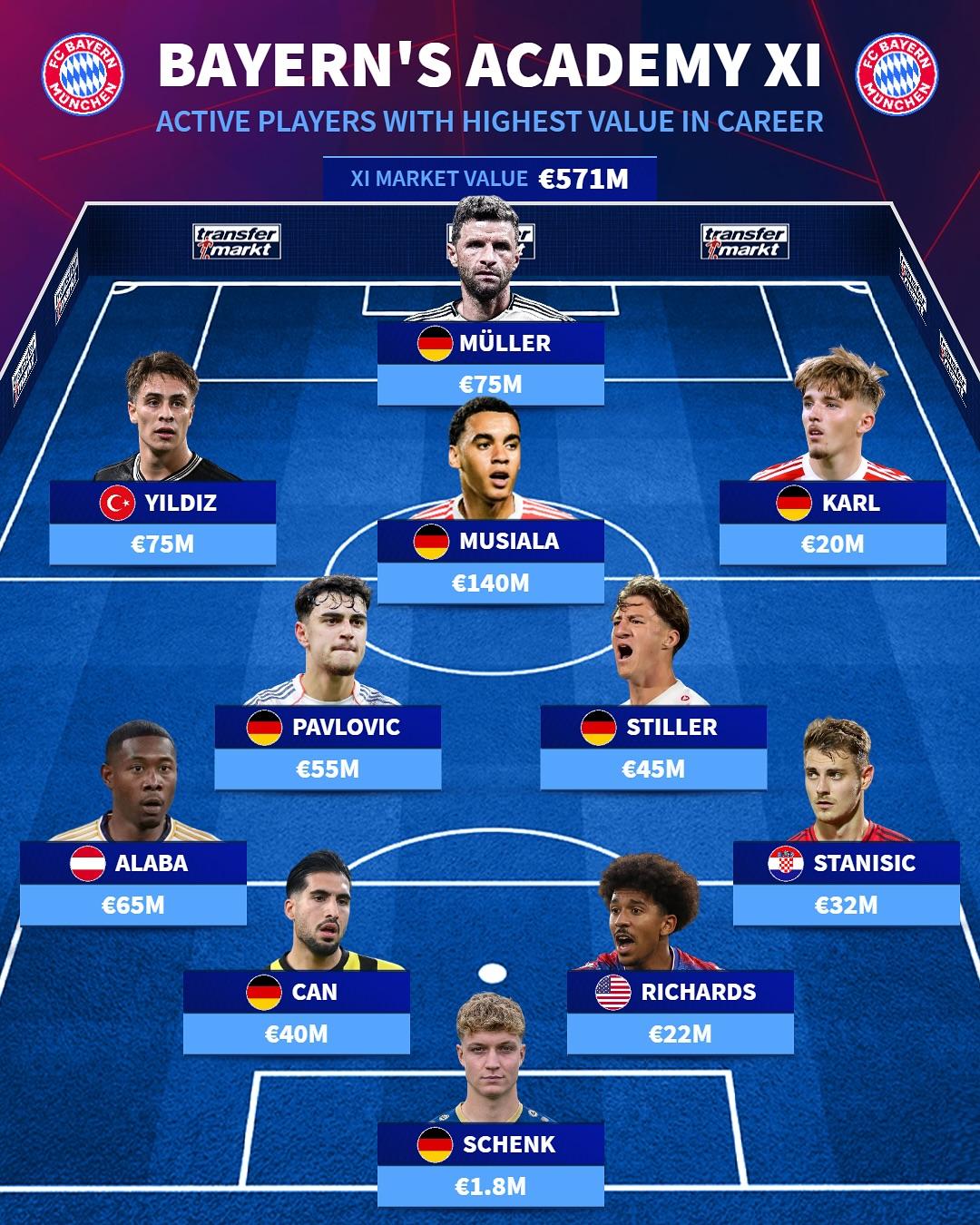虎扑10月29日讯德国转会市场盘点了出自于拜仁青训的现役球员,并组成了一套最佳阵容。