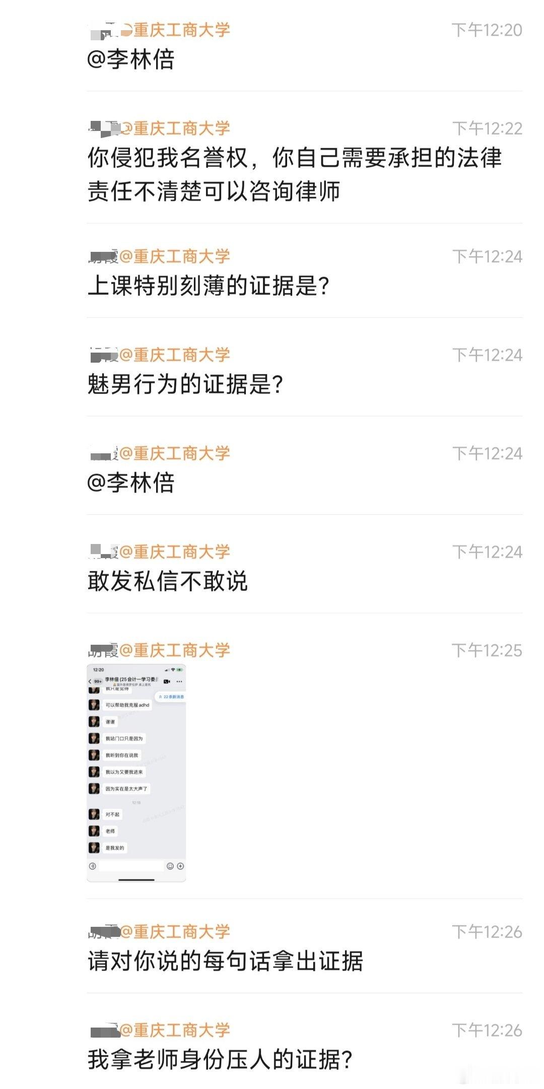 截图显示,重庆工商大学一新生女权,因为上课时老师提问的问题答不上来,居然把该校法学专业的女老师挂在了微博,造谣其上课刻薄,还媚男。