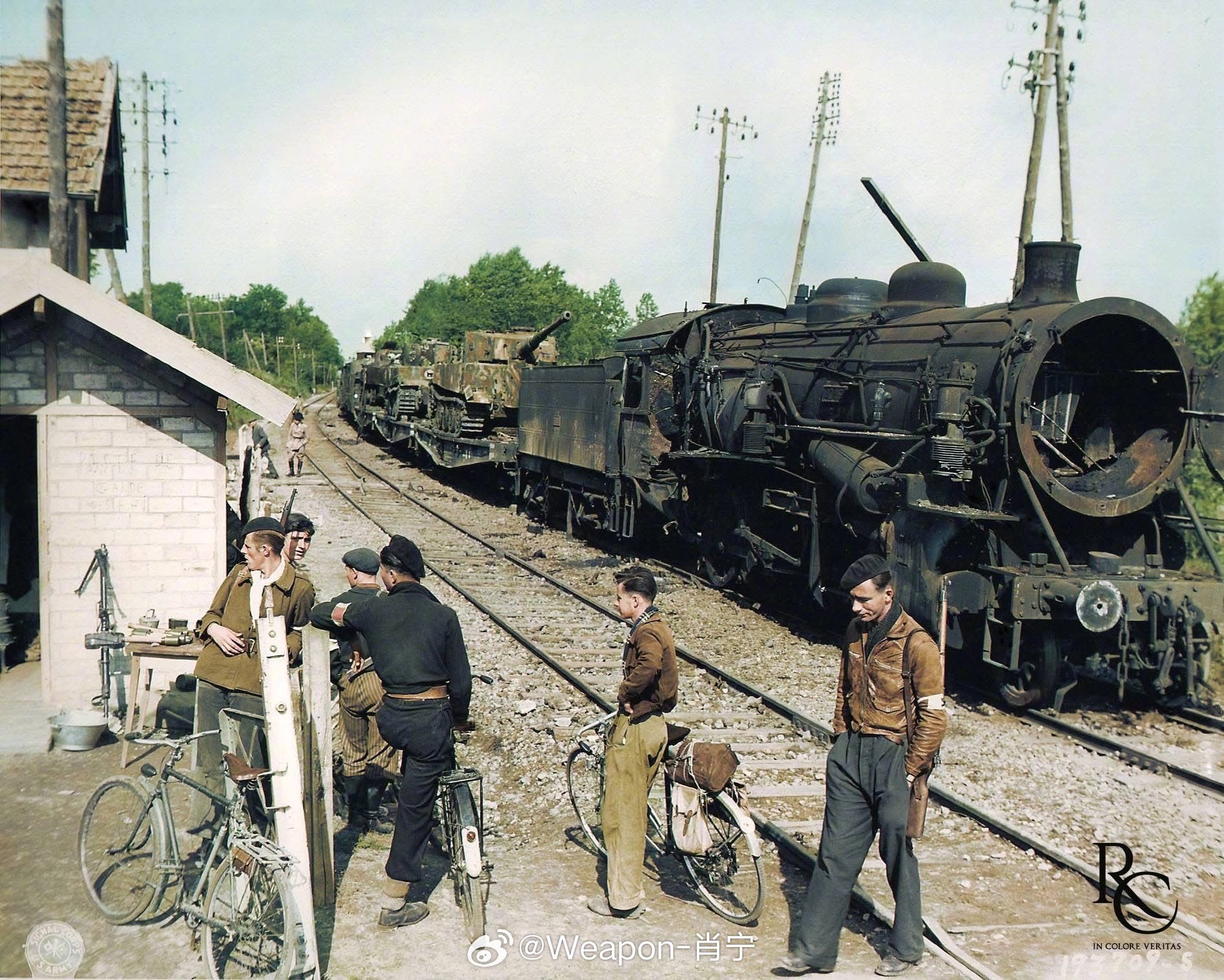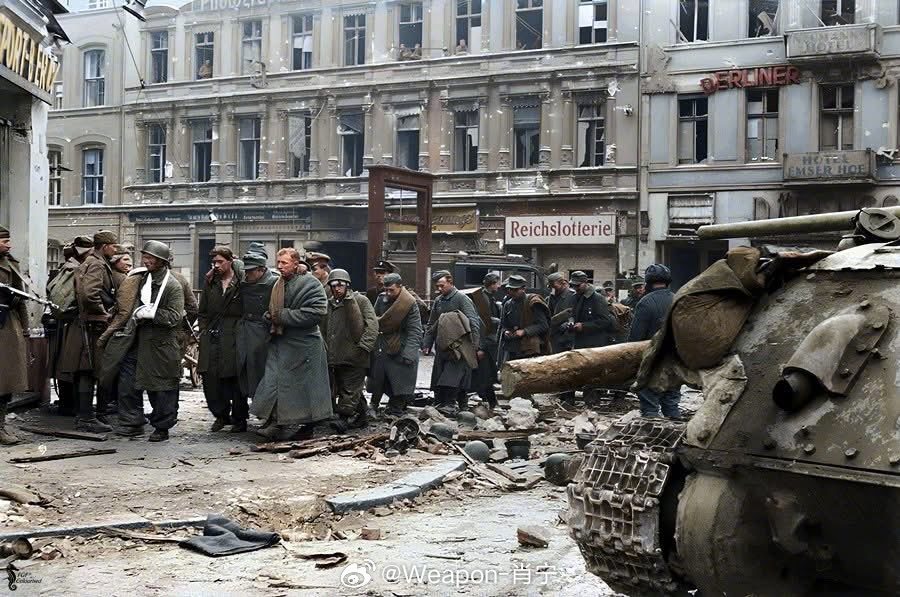 照片中的历史[超话] 图1:1944年10月,芬兰,芬兰士兵手持德国制造的“铁拳”反坦克火箭筒。图2:1944年8月28-29日。法国,德军向东撤退,盟军紧随其后。一片混乱中,美国A作战司令部的部分兵力经过布赖恩,这是一个位于苏瓦松以东18公里的小村庄。这时,法国车站站长警告说,一列从巴黎开来的德国火车将在15分钟后到达。除了第486防空炮兵营一个班的霍利斯·巴特勒中士之外,似乎没人对此感兴趣。巴特勒中士把他的M-15半履带车——车上装备着一门37毫米炮和一挺双联装.50口径机枪——从队伍中拉出来,掩护西侧的铁轨。火车出现时,巴特勒的乘员立即开火。“机车锅炉爆炸,喷出一团浓密的白色蒸汽,突然间,德军曳光弹在美军纵队周围划出一道道光痕。子弹呼啸着四处乱飞,身着黑色制服的党卫军装甲兵争先恐后地爬上一辆停在火车平板车上的坦克。巴特勒的乘员组继续射击,包括用.50口径机枪扫射车厢。突然间,德军的抵抗被瓦解,党卫军举手投降了。”美军从第一列火车上俘虏了70名战俘(另有资料称150人),并摧毁了一辆四号坦克和另外四辆中型坦克。据说有25名德军士兵阵亡。巴特勒中士及其乘员因这次行动被授予铜星勋章,巴特勒本人还获得了法国十字勋章。由于第一列火车堵塞了铁轨,30 分钟后驶来的第二列火车也被俘获,当晚晚些时候,第三列火车也被俘获,最后一列火车是在“短暂而激烈的交火”后被美国第 32 装甲团俘获的。这张摄于29日的照片中,法国抵抗组织成员正在守卫铁路道口,照片中出现的列车据信是第三列火车。根据原照片说明,缴获这列火车的士兵报告说,车上载有“四辆最新型的虎式坦克”。据说这辆六号坦克隶属于第503重型坦克旅。图3:1945年5月11日,北美P-51“野马”战斗机停放在硫磺岛北机场的停机坪上。图3:1939 年 10 月 28 日,德国 He 111 中型轰炸机在英国苏格兰汉比附近坠毁。这架轰炸机在执行侦察任务时被英国战斗机击落。图4:德国柏林,1945年5月,“5月2日上午10点,当一长队德国战俘在军官的带领下开始在城里列队行进时,我们才明白我们赢得了战争。他们行军了三个小时。”还记得指挥对国会大厦最后进攻的苏联官员亚历山大·贝萨拉布吗?一队德国士兵,包括伞兵部队和人民冲锋队成员,在苏联士兵的护送下,沿着柏林弗里德里希大街购物街行进。照片右侧是一辆苏联T-34坦克。这批战俘来自奥拉宁堡门地铁站,他们一出站就交出了所有武器装备。图5:1938年10月下旬,侵华日军在中国湖北省武汉的汉口郊区前进。图6:1944 年 9 月 23 日,中国云南省昆明步兵学校,美国士兵正在指导中国士兵使用 60 毫米迫击炮。图7:1944年,美国第101空降师伞兵下士刘易斯.莱尔德在诺曼底行动的彩排中登上了C-47运输机。图8:1941 年,英国空军第 611 中队飞行员巴里·希思与一块被击落的德国飞机碎片合影。图9:1944 年,美国海军陆战队员在谢尔曼坦克的支援下,穿越关岛的丛林。