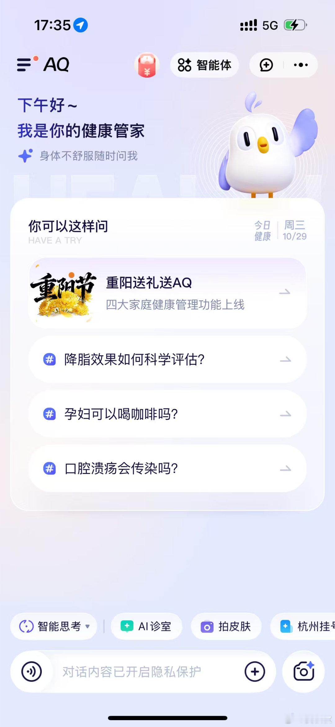 陪父母去看病,挺重要的,但你能陪几次呢?趁着重阳节,我想对子女们说,可以帮助父母,去安装一个权威的人工智能“家庭医生”,比如AQ。第一,免费。第二,家庭绑定之后,如果老人有数据异常,会随时提醒子女。第三,还有用药提醒。第四,老人还可以通过拍照功能随时咨询。