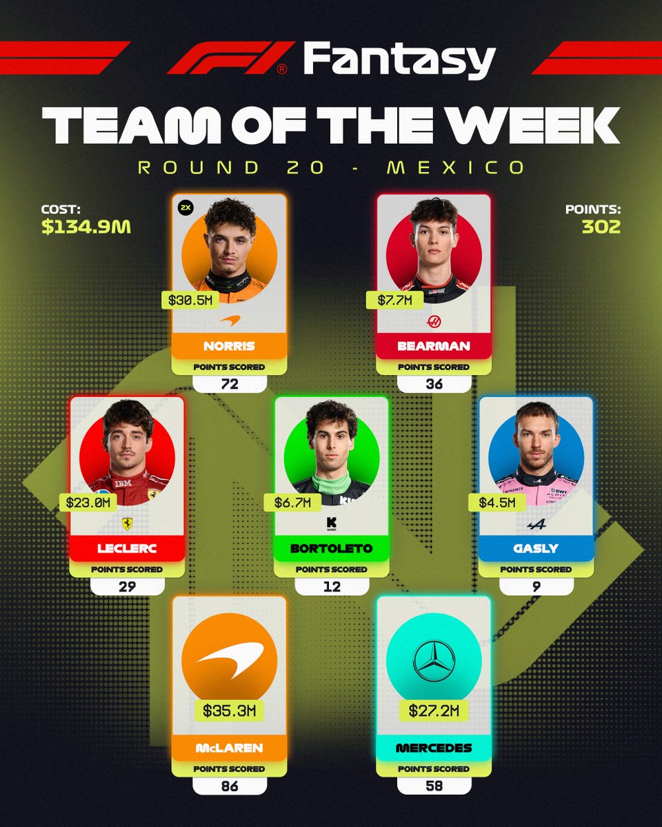 F1官方推特账号报道,兰多·诺里斯与奥利·贝尔曼在F1Fantasy中以超高积分领跑你的车队在墨西哥站表现如何?➡#F1Fantasy#MexicoGP