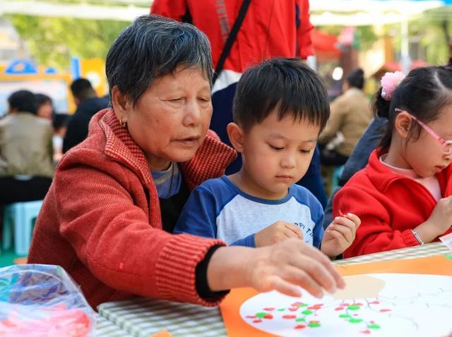 活动现场布置充满传统重阳元素,洋溢着浓浓的亲情与暖意。活动伊始,幼儿与长辈们携手合作,共同投入到充满节日气息的手工画创作中。老幼围坐在一起,小手握着大手,共同在画纸上描绘心中的祝福。一幅幅充满童真与爱意的作品,不仅是艺术的创造,更是祖孙间情感的自然流淌与默契的生动体现,浓浓的亲情在色彩交织中跃然纸上。