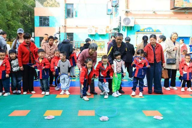 幼儿和老人进行“重阳圈圈乐”亲子游戏