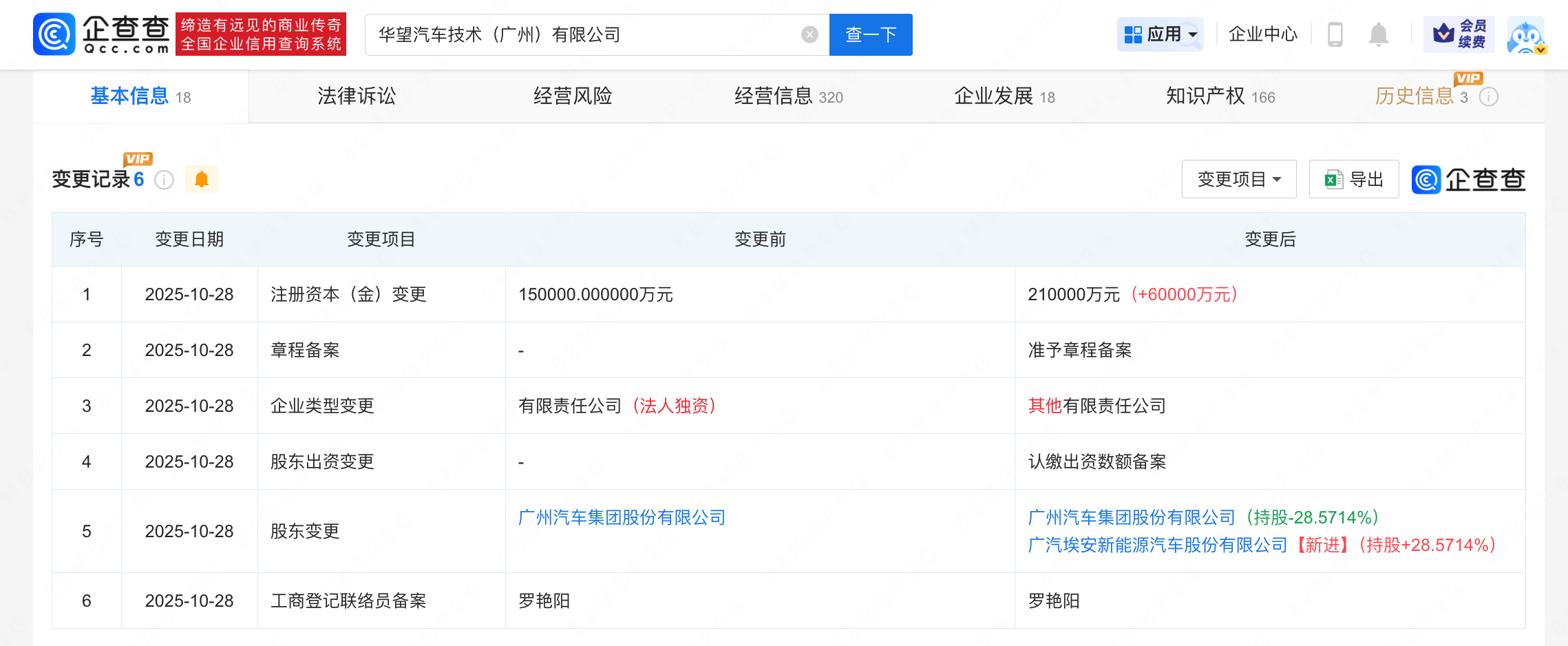 企查查APP显示,近日,华望汽车技术(广州)有限公司发生工商变更,新增广汽埃安新能源汽车股份有限公司为股东,注册资本由15亿人民币增至21亿人民币,增幅40%。企查查信息显示,该公司成立于今年3月,法定代表人为閤先庆,经营范围包括汽车销售、汽车零部件及配件制造、汽车零配件批发等,现由广汽集团(601238)及上述新增股东共同持股。