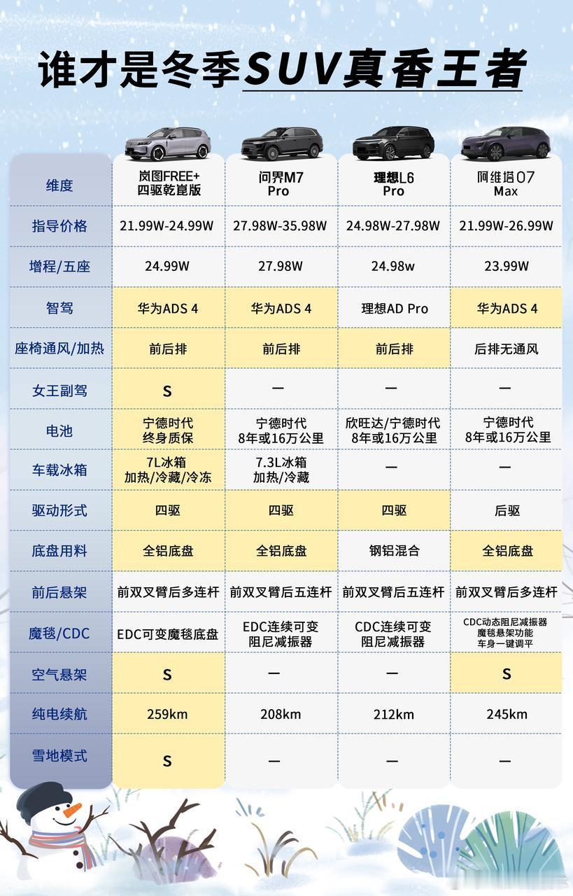 岚图FREE+问界M7阿维塔07理想L6冬季选车