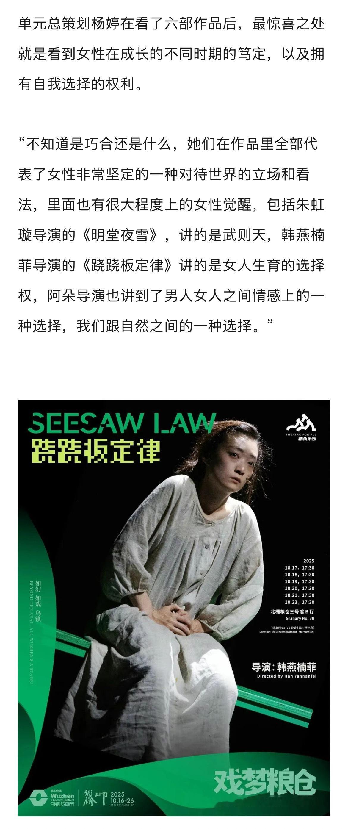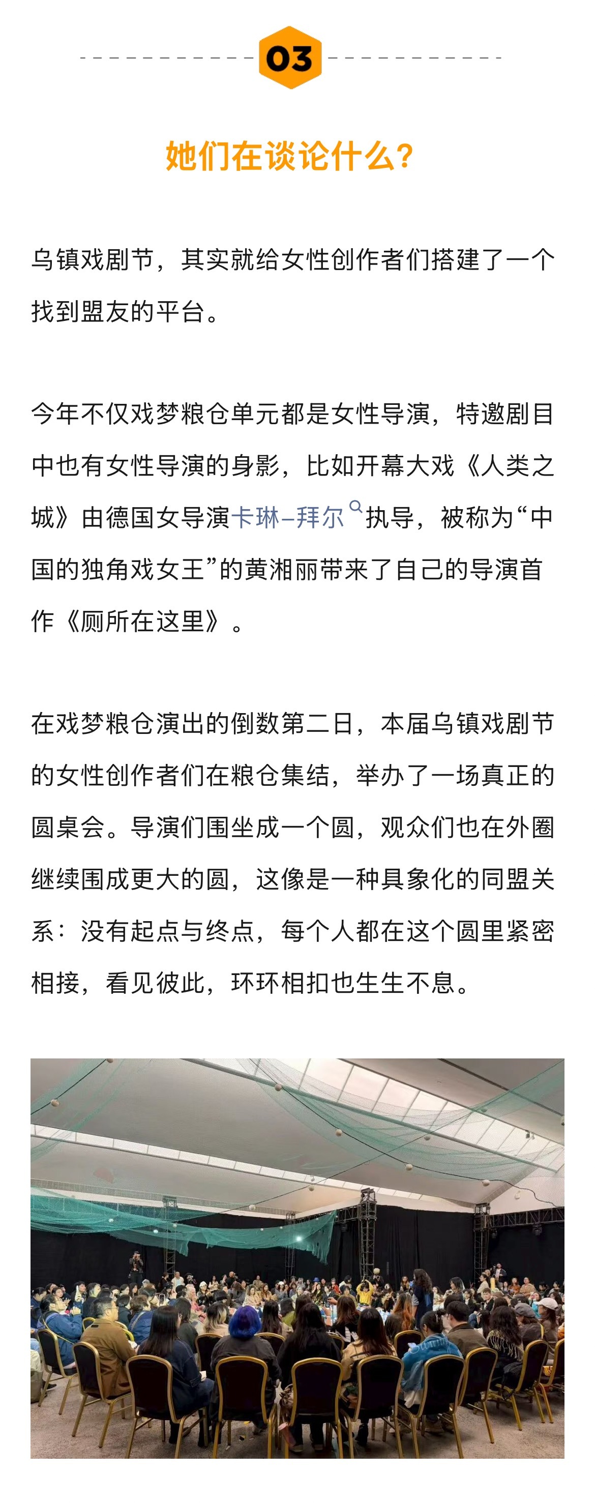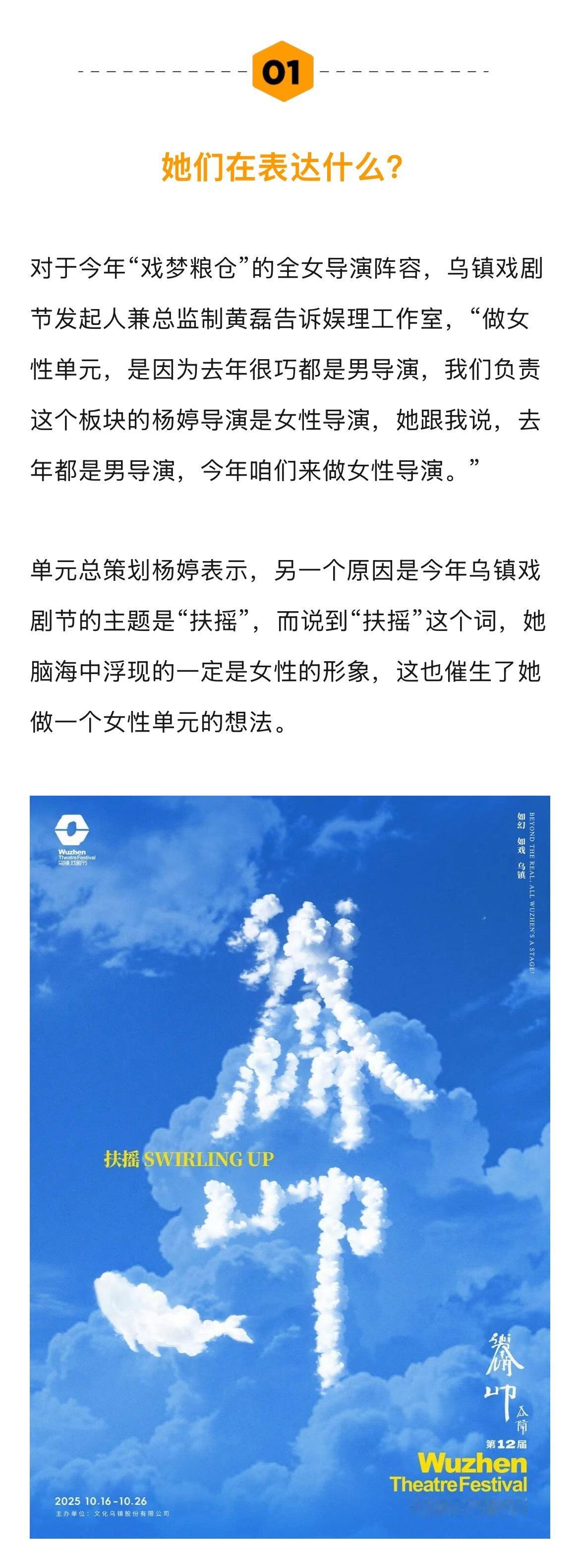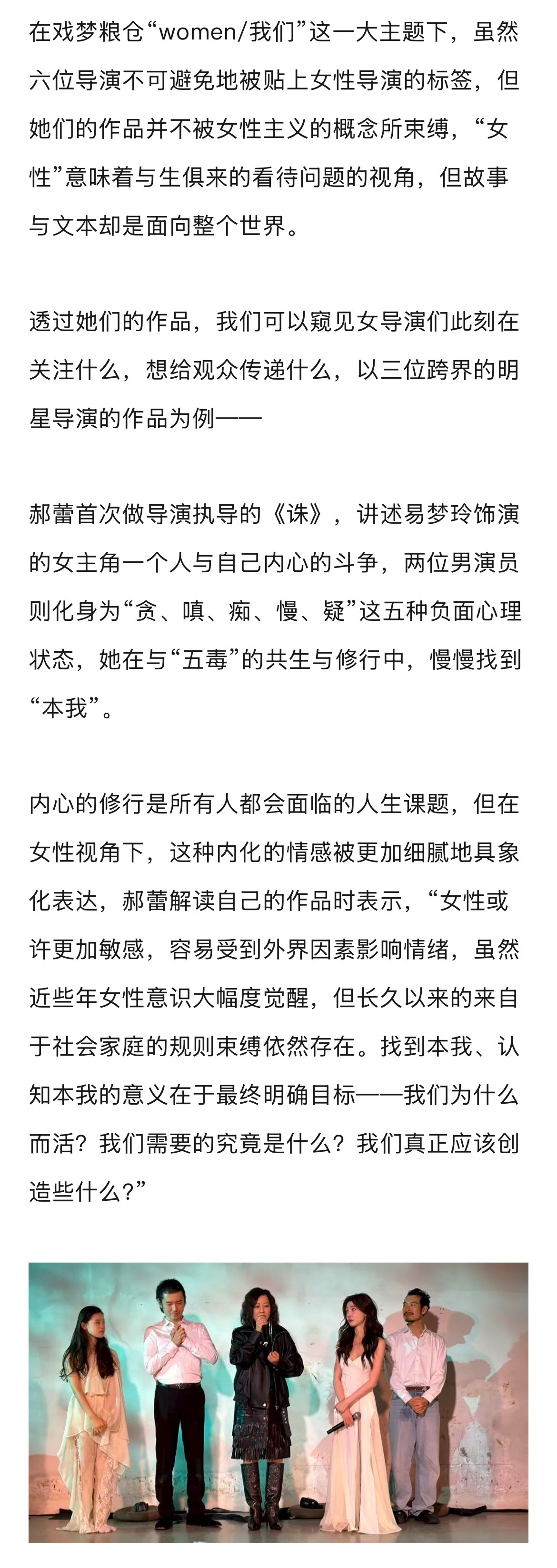 女性创作要让女观众不孤独女性创作者 像野兽一样往前冲 今年,“戏梦粮仓”是乌镇戏剧节最具话题性的单元,不仅总策划杨婷是女性,六部剧目的导演也都是女性:郝蕾、阿朵、柯蓝三位知名女星来做戏剧导演,每部新剧都一票难求的朱虹璇再出力作,乌镇戏剧节的老朋友肖竞和韩燕楠菲也带来新作品。