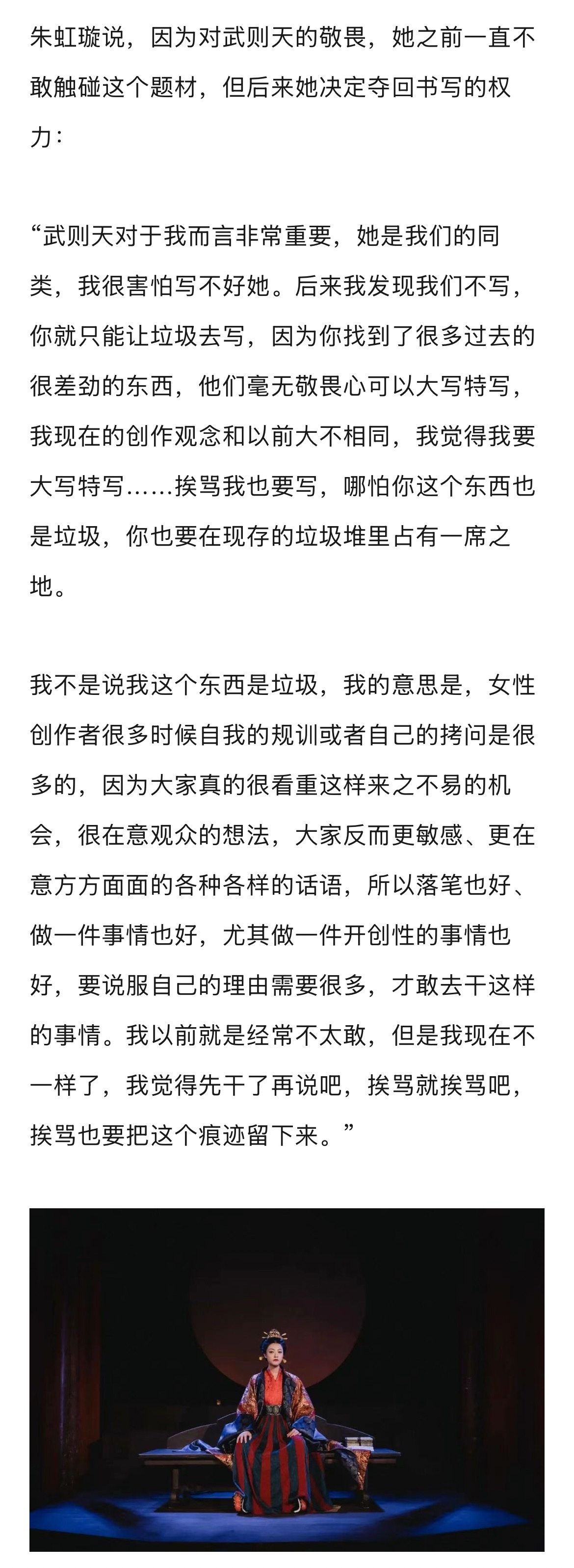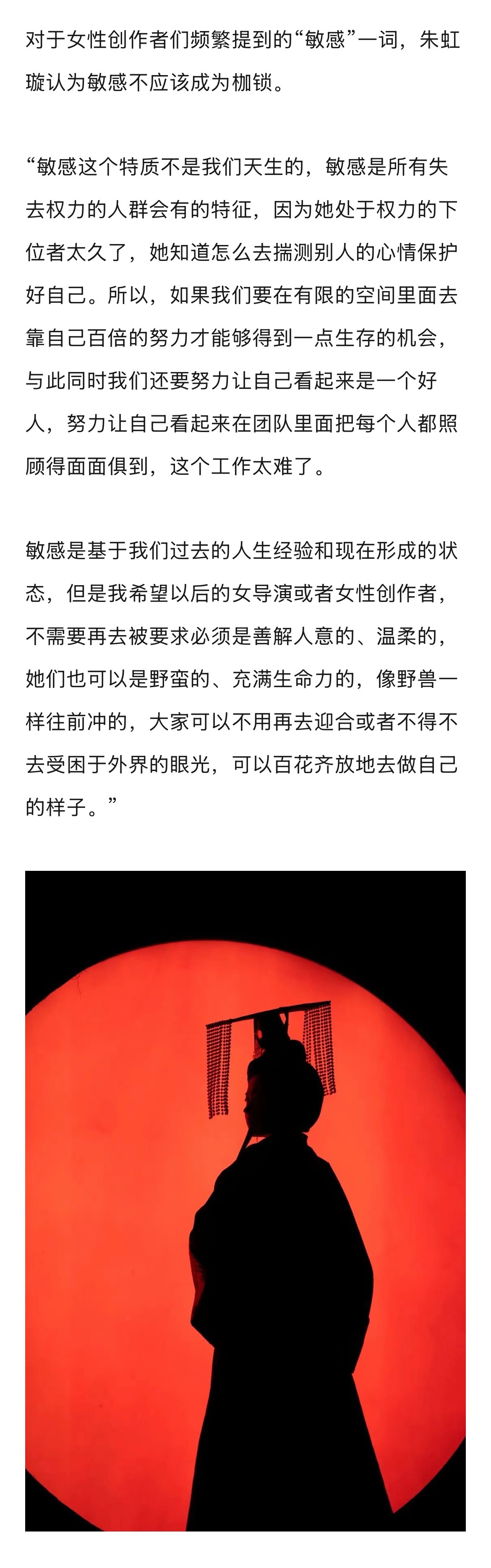 朱虹璇则谈到了创作《明堂夜雪》源自于她决定夺回书写的权力:“挨骂我也要写,哪怕你这个东西也是垃圾,你也要在现存的垃圾堆里占有一席之地。我不是说我这个东西是垃圾,我的意思是,女性创作者很多时候自我的规训或者自己的拷问是很多的,因为大家真的很看重这样来之不易的机会,很在意观众的想法,大家反而更敏感、更在意方方面面的各种各样的话语,所以落笔也好、做一件事情也好,尤其做一件开创性的事情也好,要说服自己的理由需要很多,才敢去干这样的事情…”娱理独家↓