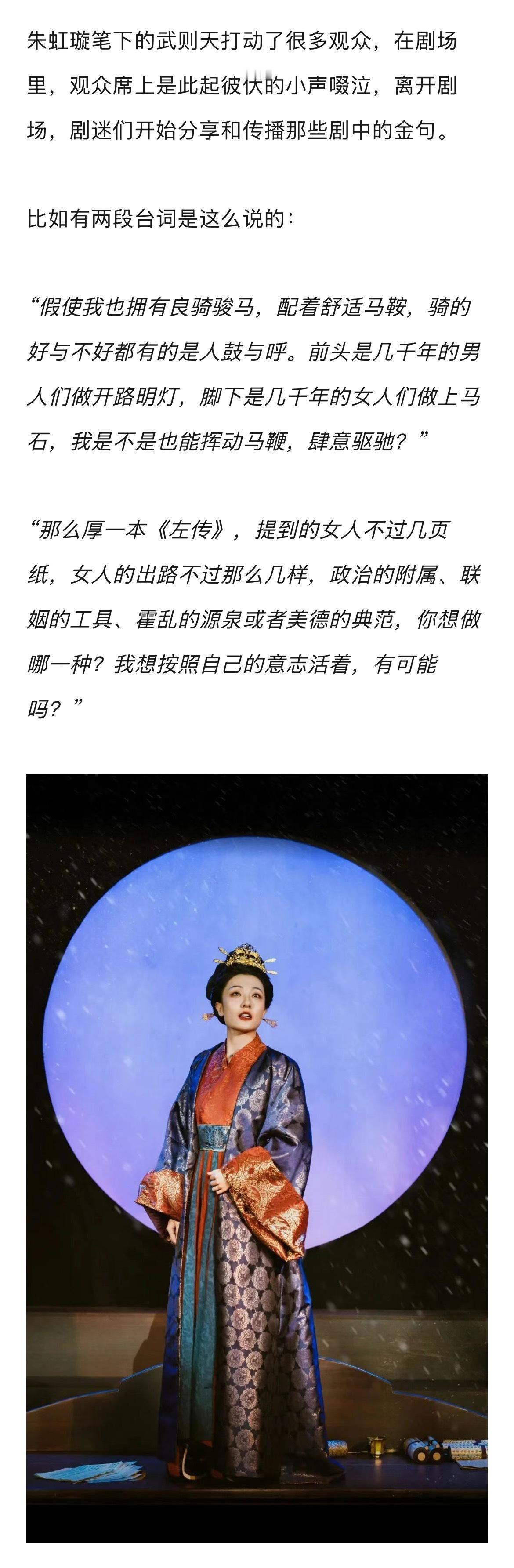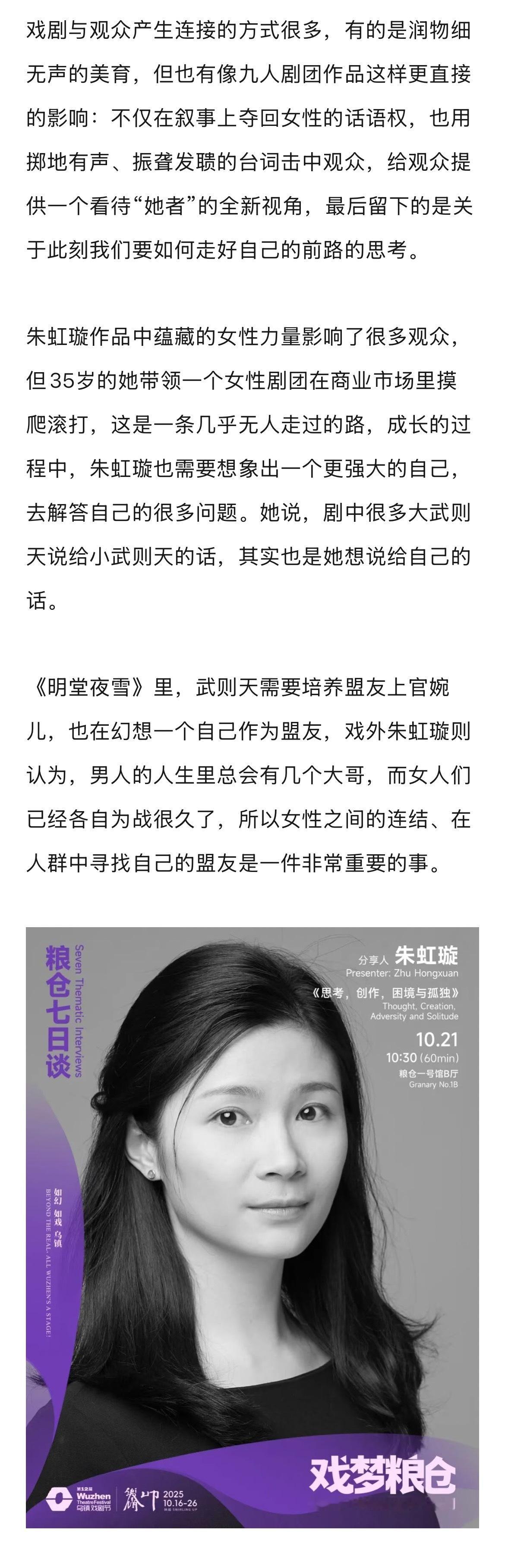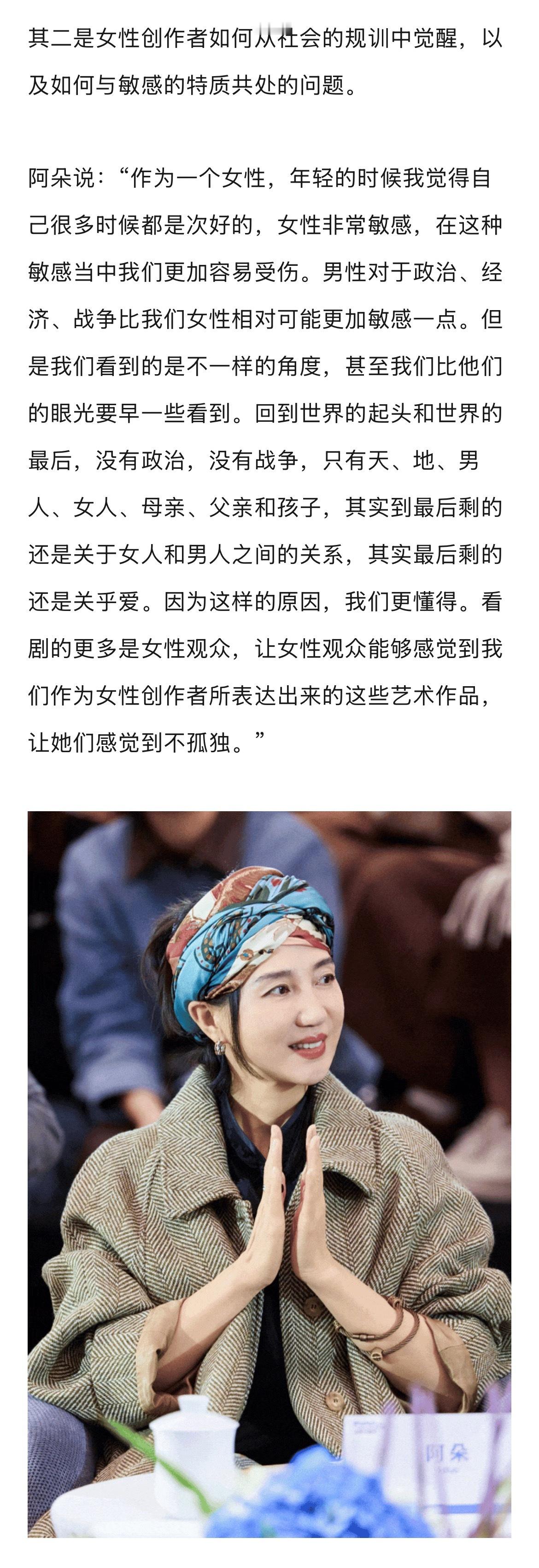 阿朵自编自导自演的舞台剧《天生傲骨》今年开启了全国巡演,此次她在乌镇带来的是《天生傲骨》的前传《TA知道》。阿朵认为 “女性创作者强调个人感受并不是‘只关注自己’,而是要先了解自己的内心、感受自己的情绪,这样才能做到同理他人,这份同理能力,正是创作中非常重要的一部分。”