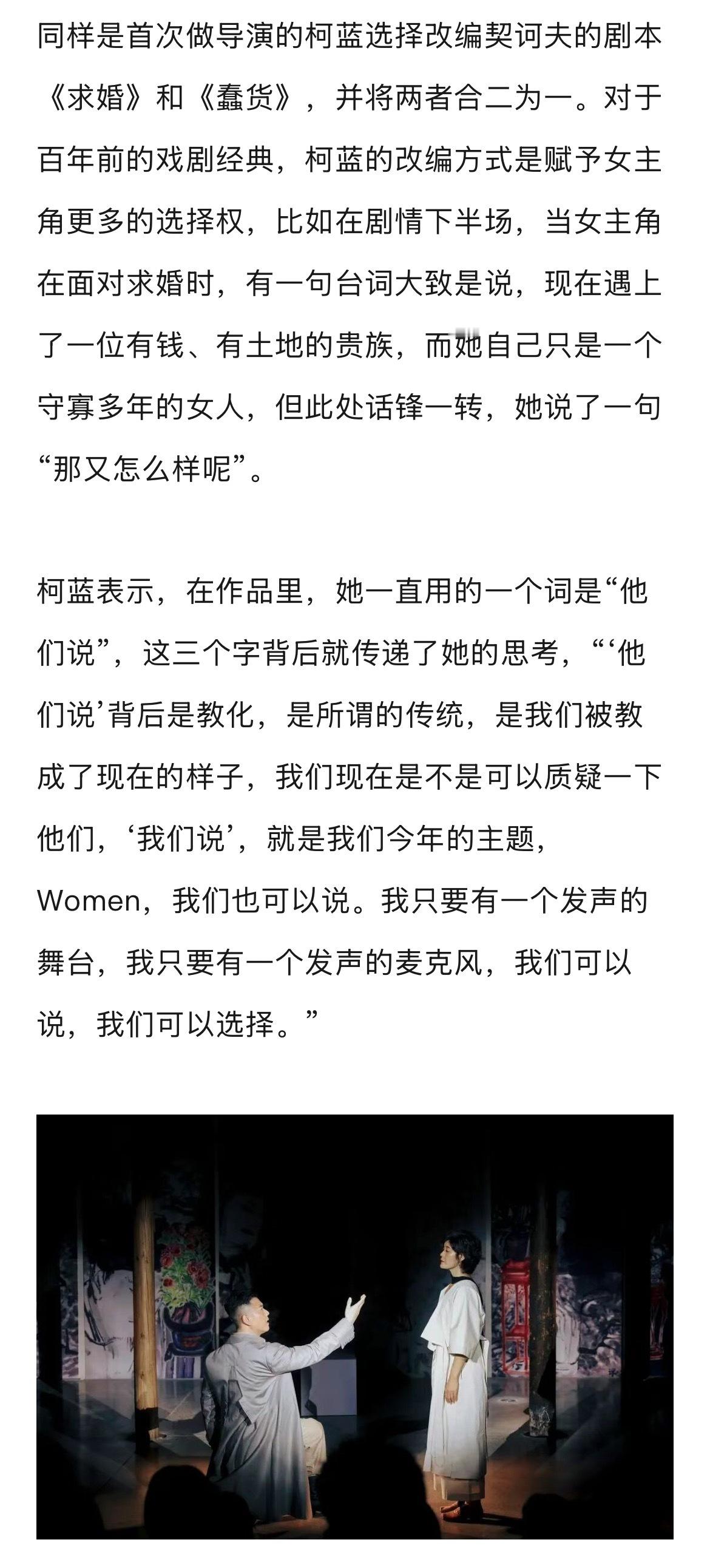 同样是首次做导演的柯蓝选择改编契诃夫的剧本《求婚》和《蠢货》,并将两者合二为一。柯蓝表示,在作品里,她一直用的一个词是“他们说”,这三个字背后就传递了她的思考,“‘他们说’背后是教化…我只要有一个发声的舞台,我只要有一个发声的麦克风,我们可以说,我们可以选择。”