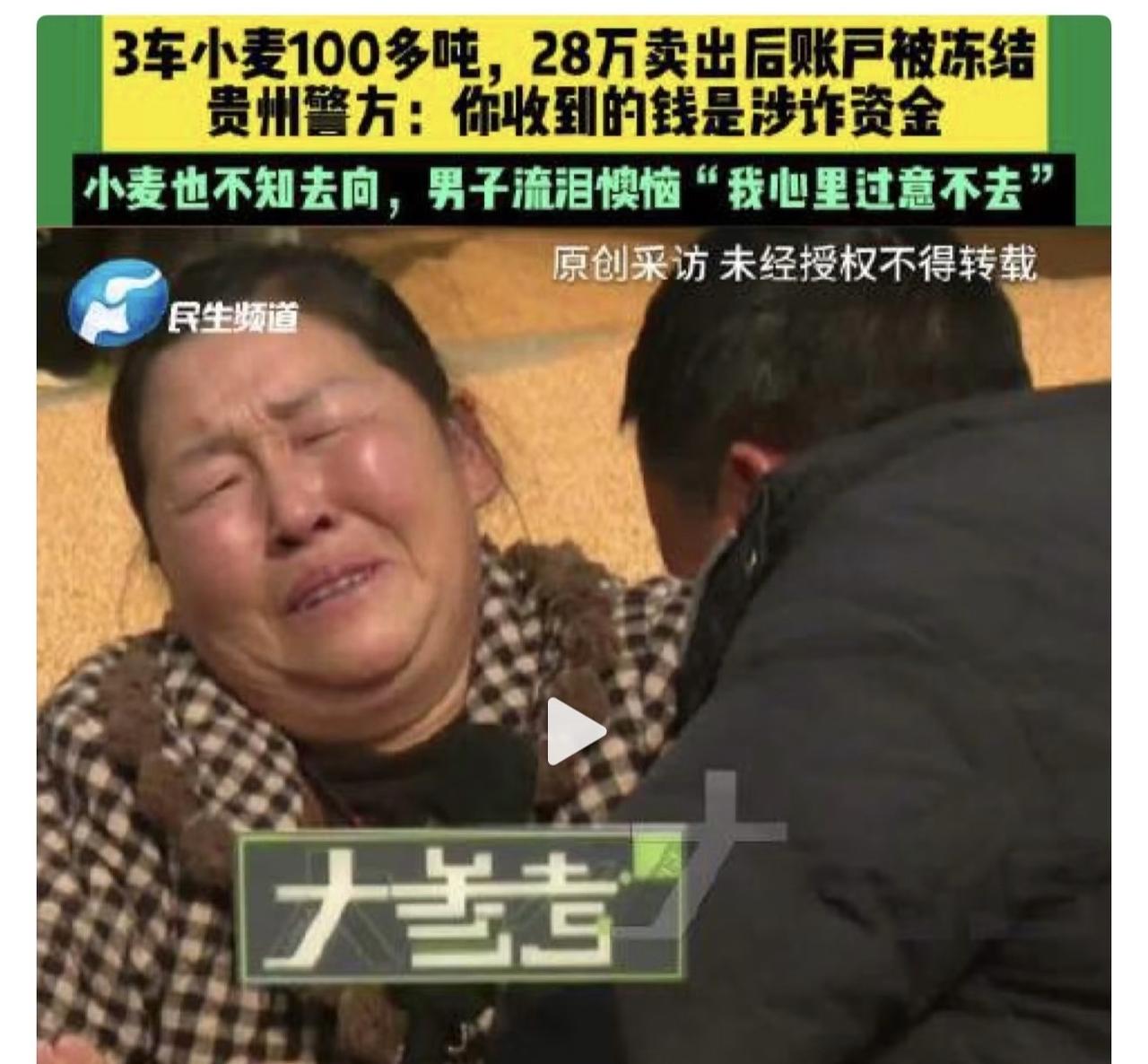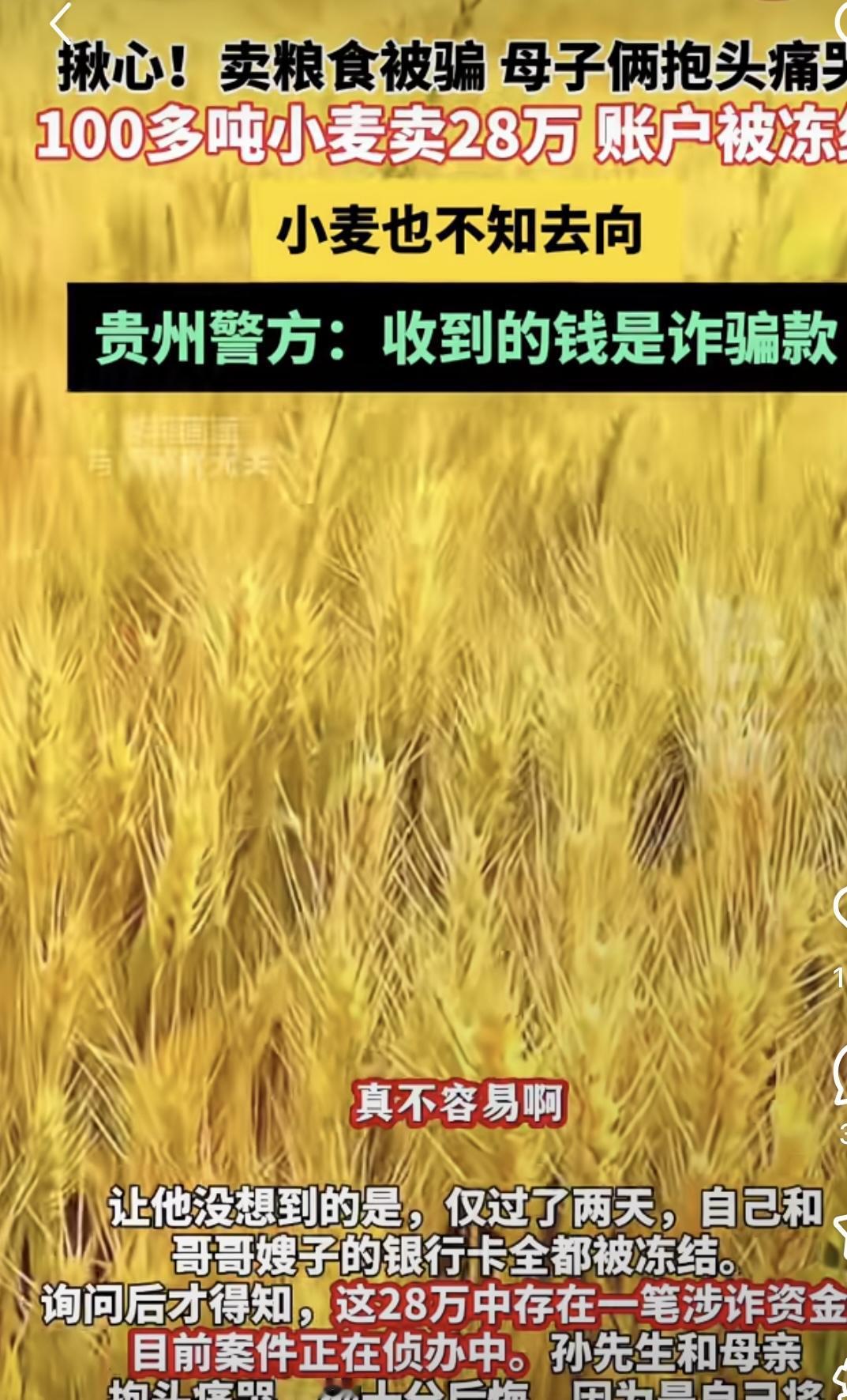 有人冒充收购商高价收小麦,其实根本不是真买粮,而是用骗来的赃款打款,农户收到的钱会被银行追回,粮发了钱也没了,100吨小麦白送人。这波叫“洗钱式收粮”,防不胜防。以后收钱一定查对方身份证和银行卡是不是一个人,不然真会钱粮两空。现金最安全,转账必验人,别等被骗了才后悔。