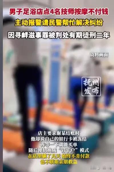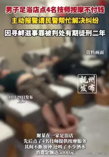 上海,男子到一家足浴店,连续叫了4个技师,为他按这按那,他连续加钟,还点了不少酒水,在那慢慢享受,消费金额直达5000元,后来店家让他付款,他却说卡被冻结了,就在店里躺几天,后来又说没钱要赊账,店主拒绝了他,坚决要他马上付钱,没想到他竟然还报警了,不料他碰到正规的店。 谢某一进足浴店,就装成财大气粗的样子,别人都是叫一个技师,按按手,按按脚就可以了。 他跟别人可不一样,他一进店,他的口气就非常大,一下子点4个技师,让她们轮流替他按这按那。 4个技师一看这个谢某口气不小,都以为谢某是个有钱人,都卖命地为他按这按那,听从他的指挥,她们都很敬业,也很听话。 果然,她们的眼光没有错,不用这些技师多说一句话,这个谢某也是主动加钟,为了更好的享受,他还点了不少的酒水,这些酒水价钱也不便宜,但他毫不在意。 酒水端上桌,他就慢慢品尝,享受技师们带给他的轻松。 遇到这样的大顾客,4个技师都很高兴,不但为谢某按这按那,更是把谢某哄得很开心,大家都希望这个谢某能冲一冲她们的业绩。 谢某也没有让大家失望,加了钟,点了酒水,一套服务下来,就消费了5000元。 看着谢某消费了这么多钱,技师们这才高兴地离去。 很快到了付款环节,让人意外的事情发生了。 这个谢某享受完之后,竟然没有离开的意思,店主就觉得奇怪了,就过来让他付款,但这个谢某就说了,他的卡已经被冻结了,要等卡解冻之后才能付款。 于是,这个谢某就在店里待了下来,店主以为谢某说的是真的,卡应该用不了多久就解冻了。 可这个谢某一待就待了几天,几天了都没有付款的意思,问他要钱,他就说卡被冻结了,他也不着急,也没有想过要打电话给亲朋好友,帮忙付一下款,他就那样,安心安理得地在店里躺了几天。 店主看着他一副无赖的样子,终于意识到,谢某根本就不是有钱人,他的卡也没有冻结,他就是在耍赖。 于是店主再一次去要他付款,就算卡冻结了,也要他找亲朋好友借钱,这时候谢某也终于说实话了,说自己没有钱,要赊账。 终于店主知道了谢某的真实意思,他就是想赖在这里,不付钱。 这样的人,店主可不怕他,没有人可以只贪图享乐,不用付钱的。 虽然他已经享受了,那么他就要付钱,否则他也不会轻易让谢某离开店。 谢某一看,店主没有商量的余地,就是要他付款,他决定使出自己的最后一招,那就是报警,他想让店主害怕,放他走。 可没想到这一次他失算了,这个店主根本不怕事,他的店就是正规的足浴店,谢某贪图享乐,消费完,还不付钱,还敢报警,正如店主所意。 谢某这一报警,将自己送了进去,民警过来之后,也是调查了谢某的过往,结果发现谢某在足浴店,消费完不付款,这样的事可不是第1次发生。 就在4月份,他就在三家足浴店消费过,可每一家他都不付款,店主也是拿他没有办法。 估计这一次他也是想故伎重施,也想消费完不付钱,可没想到这一次他栽跟头了。 那么如何认定谢某的行为呢? 首先,谢某进店消费与足浴店构成合同关系,他是应当履行自己的支付义务的。 《民法典》第509条规定:当事人应当按照约定全面履行自己的义务;当事人应当遵循诚信原则,根据合同的性质、目的和交易习惯履行通知、协助、保密等义务。 谢某在该店消费了5000元,却想一分钱都不付,他的行为肯定是不对的,他如果不付钱,该店就损失5000元,该店肯定是不会同意的。 其次,谢某一开始就不想付钱,他的行为也不止这一次,已经4次了,他就是故意找事的,所以他的行为已经构成了寻衅滋事罪。 《刑法》第293条规定:有下列寻衅滋事行为之一,破坏社会秩序的,处五年以下有期徒刑、拘役或者管制: (一)随意殴打他人,情节恶劣的; (二)追逐、拦截、辱骂、恐吓他人,情节恶劣的; (三)强拿硬要或者任意损毁、占用公私财物,情节严重的; (四)在公共场所起哄闹事,造成公共场所秩序严重混乱的。 纠集他人多次实施前款行为,严重破坏社会秩序的,处五年以上十年以下有期徒刑,可以并处罚金。 谢某正是因为自己的行为,他为此付出了代价,将会受到刑事处罚。 那么你对谢某的行为有何看法呢?
