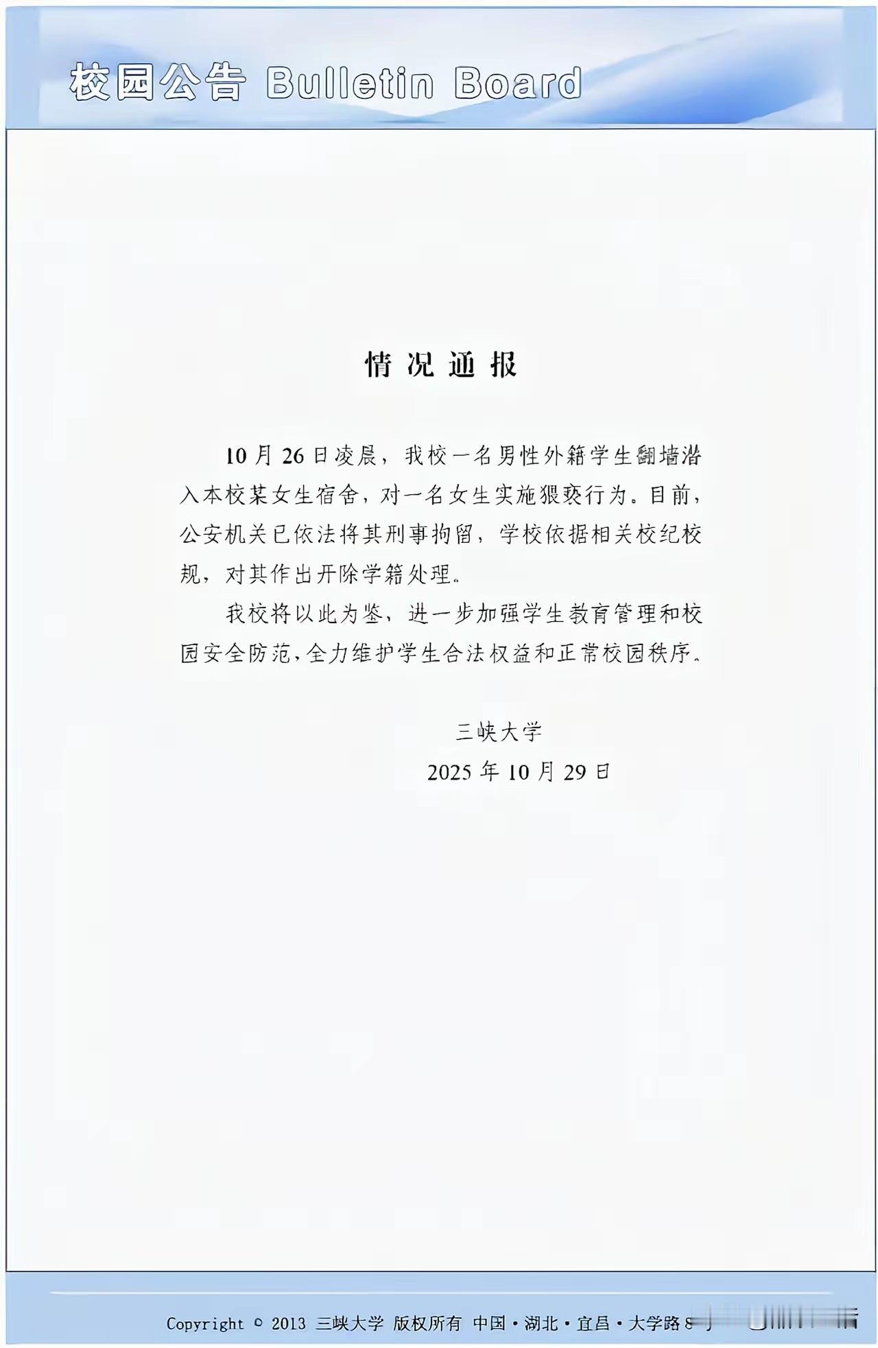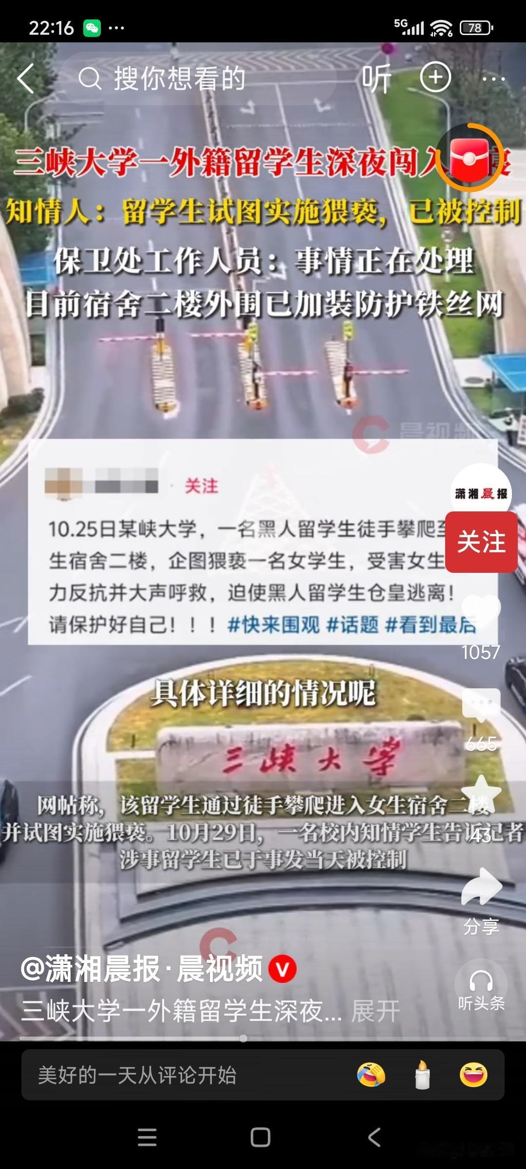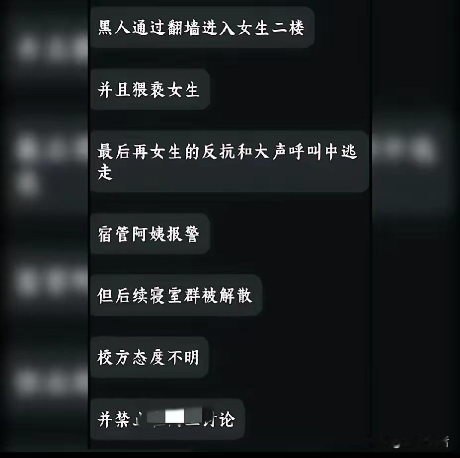 三峡大学,一本,600+的分数,留学生有60个国家,1500名,住双人公/寓,有独/立卫生间,热水器,还能在公共厨房做饭,有公共洗衣房,条件不是一般的好! 这次黑人留学生,敢徒手爬到二楼,去本科女生宿舍,6人间,wx,被拒后,还打伤女生,真的是胆子不小啊! 学校反应,26日当晚,宿管阿姨报/警,但是寝室群不让聊此事,被解散了, 第二天加装安全/网, 29号通报出来,此人被开除! 其实也给他留了很大面子,哪个国家的,哪一届的都没有通报, 希望把他送回国,不要再在我们这儿霍霍! 留学生,比我们的本科生,拥有好的住宿,好的培养方案, 总觉得自己高高在上,前段时间,留学生学校健身房,打/伤本院男生,也不知道怎么处理的?
