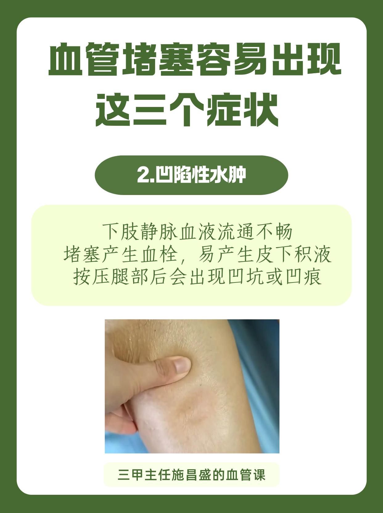 血管堵塞容易出现这三个症状。血管堵塞有三个明显症状!一是下肢静脉堵塞会致腿部肿胀疼痛,严重时酸痛钝痛;二是易出现凹陷性水肿,按压有凹坑;三是动脉血管堵塞,腿部会发白发凉,皮肤颜色异常还伴疼痛,快重视!