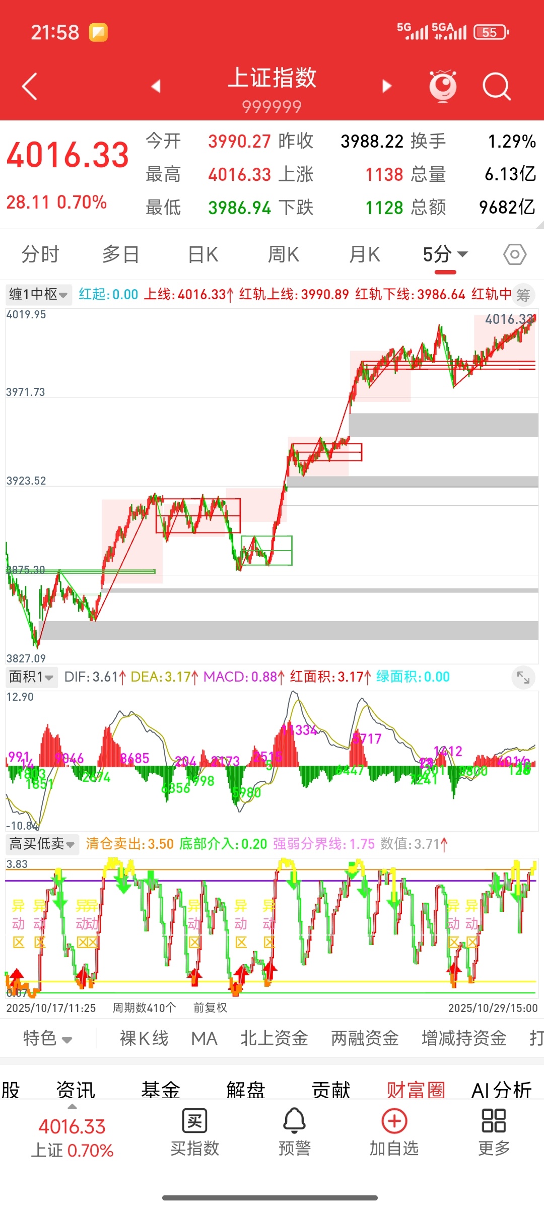 走势上看这里再次突破新高,昨天我们判断这里30分钟向上一笔将赢来盘整,这个盘整不排除继续新高的可能,今天比预期的走势更强,短期来说这里不应该追高了,等待回补的仓位可以再观望一下等待盘中的急跌。明天是赌三季报预期最后一天,大家抓好套利机会。