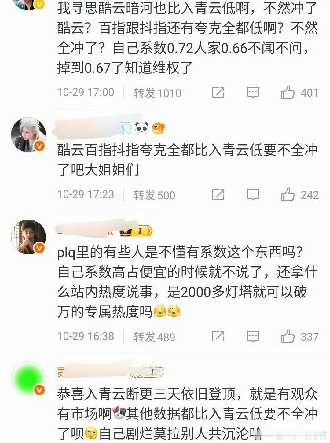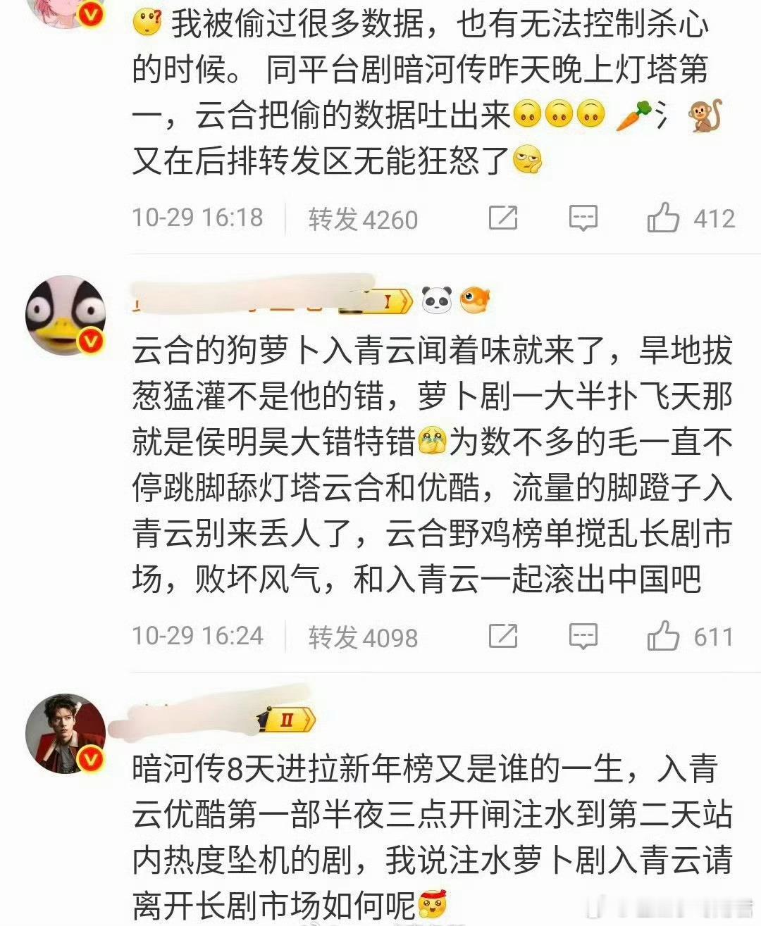 暗河传 云合评论区云合数据于10月27日将《暗河传》评级升至S+,但剧粉认为该评级未能充分体现剧集质量。灯塔数据显示《暗河传》10月28日单日播放量3081万(同期第一),但云合市场占有率仅10.1%,落后于《入青云》(10.6%)。酷云播放量同日下降8万,与云合走势一致,但灯塔数据矛盾引发质疑。