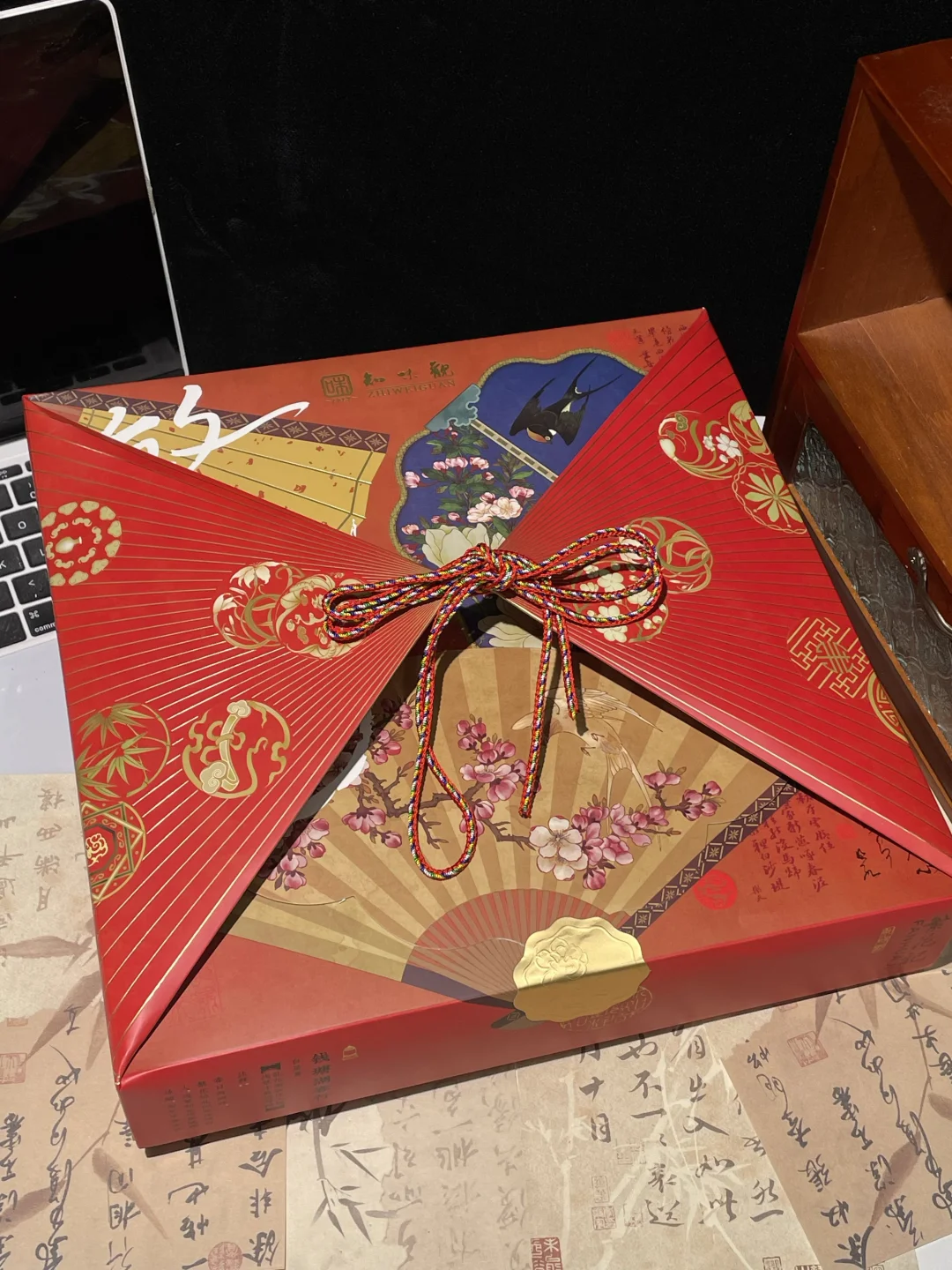包装是古代食盒及其布袋设计特别有创意,礼盒的上的扇子🪭图案和色调都是满满的中式风格,一整个高级感拉满!