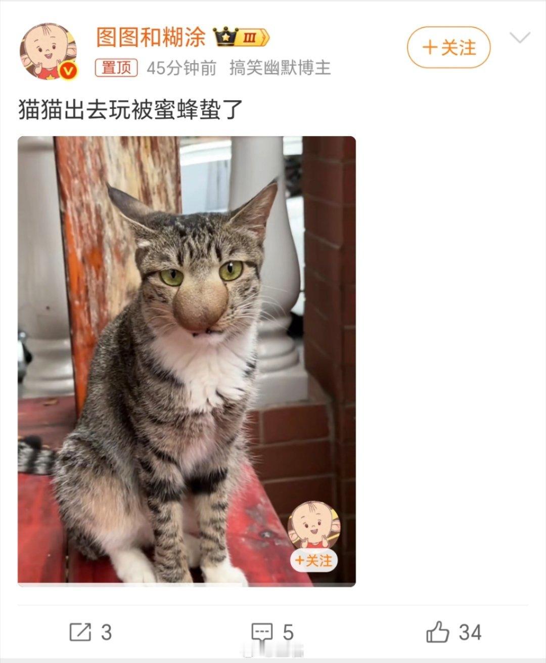 猫猫出去玩被蜜蜂蛰了这两条竟然可以连着看……再凶的猫🐱碰到蜜蜂🐝都得服软[doge][doge]猫中鳌拜