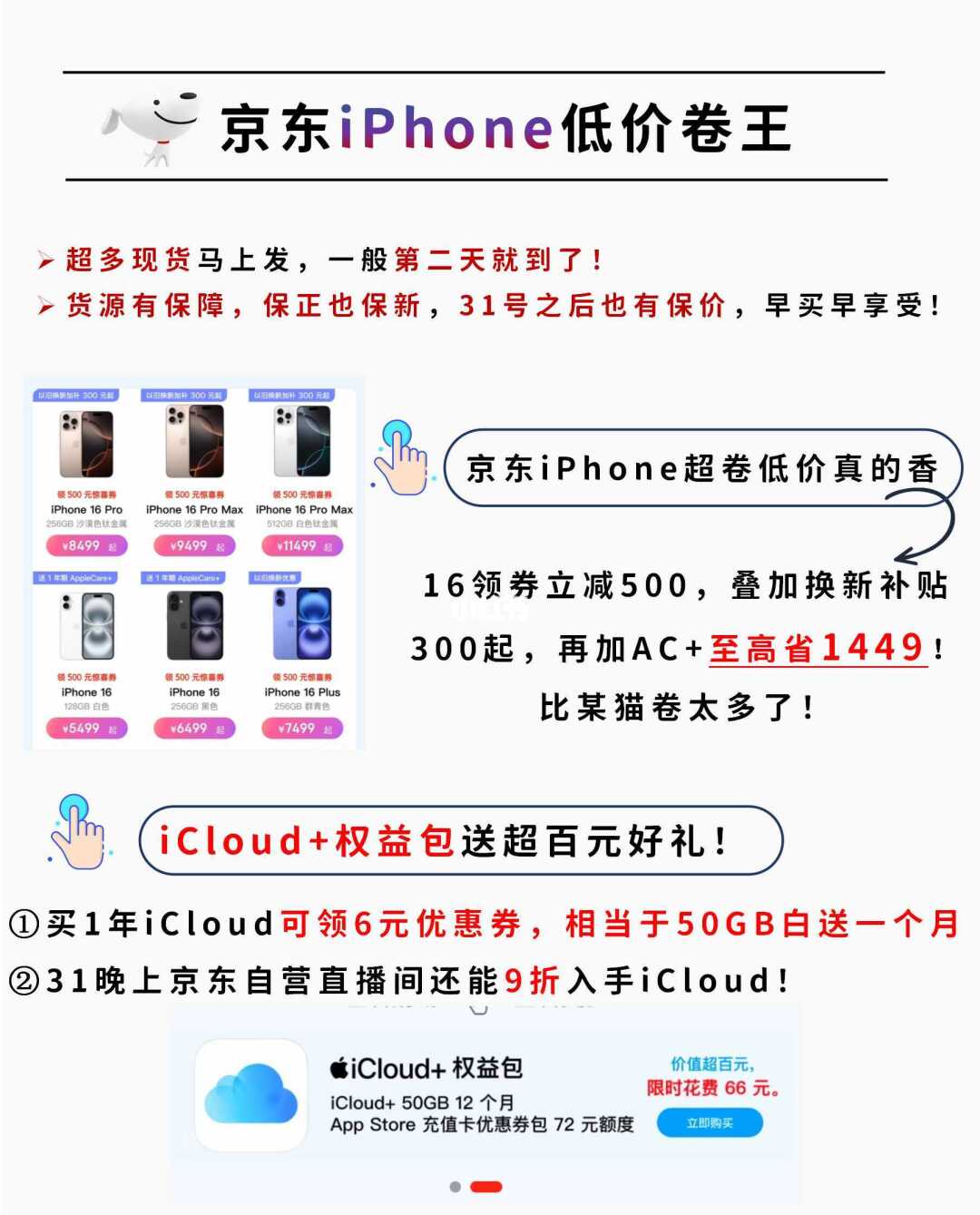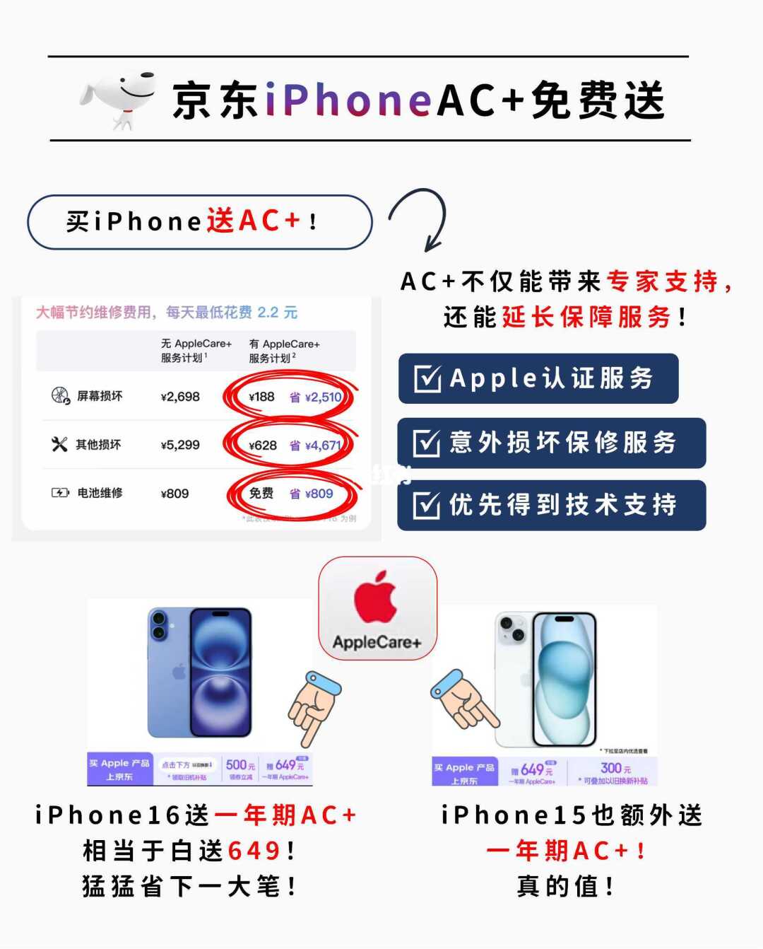 🔸iPhone16 京东立减500→叠加300以旧换新补贴,到手5199起,还送1年期价值649的AC+!