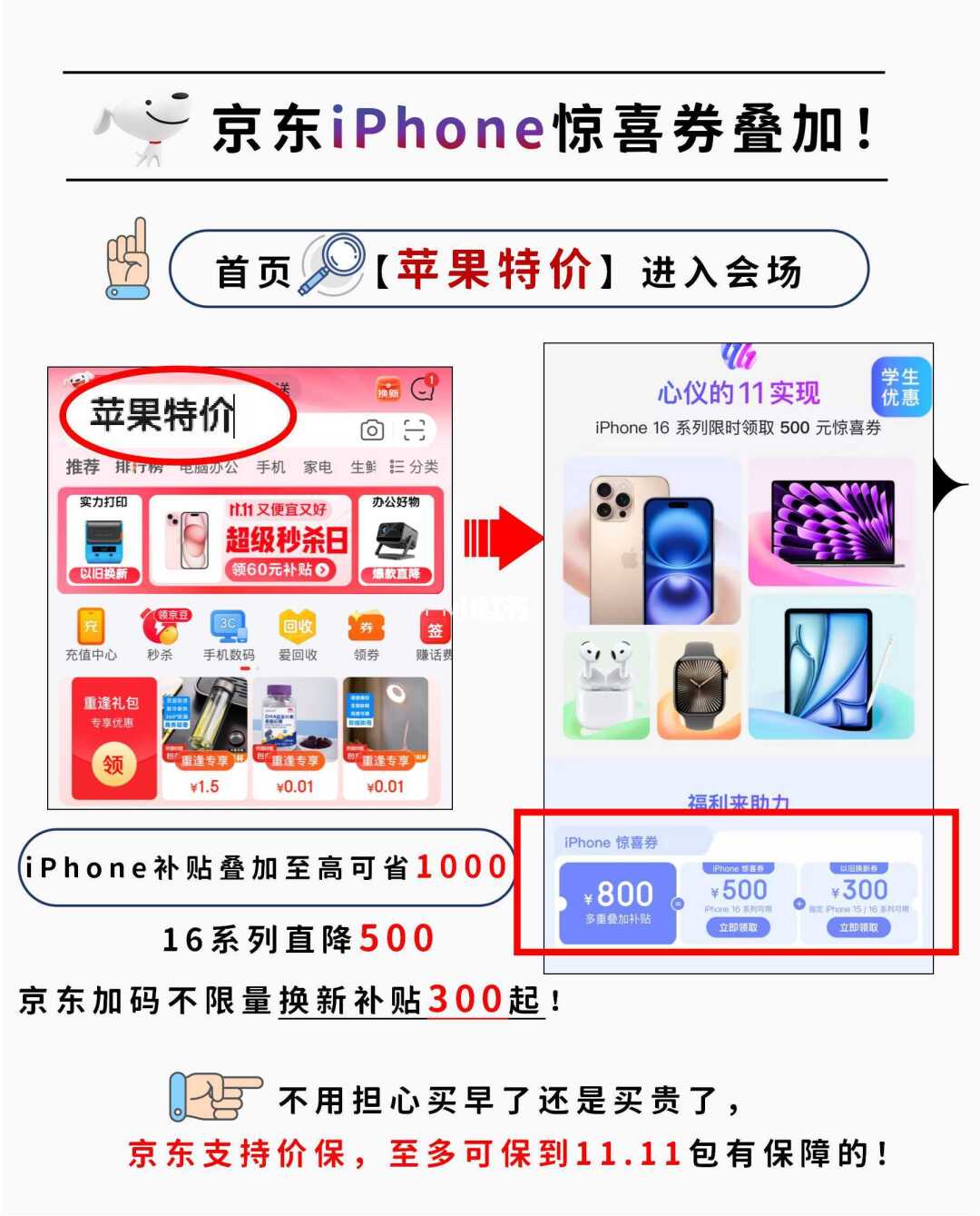 ✨不得不说京东现在这波力度应该是在平台中坠适合入手新iPhone的了,只要在京东上🔍~【苹果特价】直达会场,进场就先把500的惊喜券和加码不限量300起的换新补贴拿到手,这两个一叠加坠高能省下1000!还不用担心买早了还是买贵了,京东支持价保,至多可保到11.11,包有保障的!