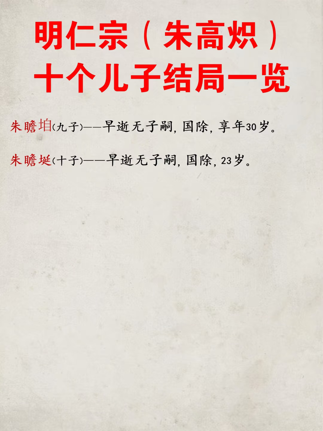太爷爷朱元璋,71岁驾崩; 爷爷朱棣,65岁驾崩; 父亲朱高炽,48岁驾崩; 🍃明仁宗朱高炽和明宣宗朱瞻基携手开创了继明成祖朱棣永乐盛世之后的又一个辉煌治世。 👉然而,这对父子却并不长寿,实在令人惋惜,朱高炽的十个儿子当中,竟有八个都未能活到超过五十岁,命运的无常在他们身上体现得淋漓尽致。 👉想想看,若有着 “六边形战士” 之称的朱瞻基寿命能够再加上二十年,或许他就能够精心培养出一位合格的皇位继承人吧!