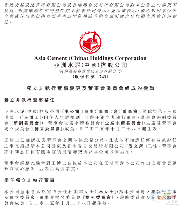 10月28日晚,亚洲水泥发布独立非执行董事变更及董事会委员会组成变动的公告。