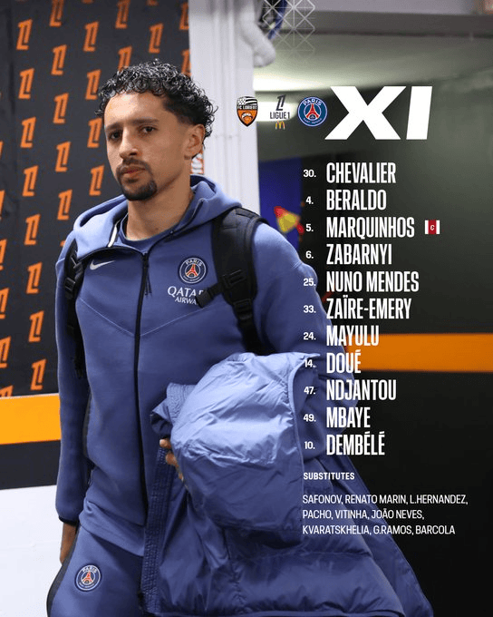 巴黎首发:30-舍瓦利耶、4-贝拉尔多、5-马尔基尼奥斯、6-扎巴尔尼、25-努诺-门德斯、33-扎伊尔-埃梅里、24-马尤卢、47-恩贾恩图、14-杜埃、49-姆巴耶、10-登贝莱
