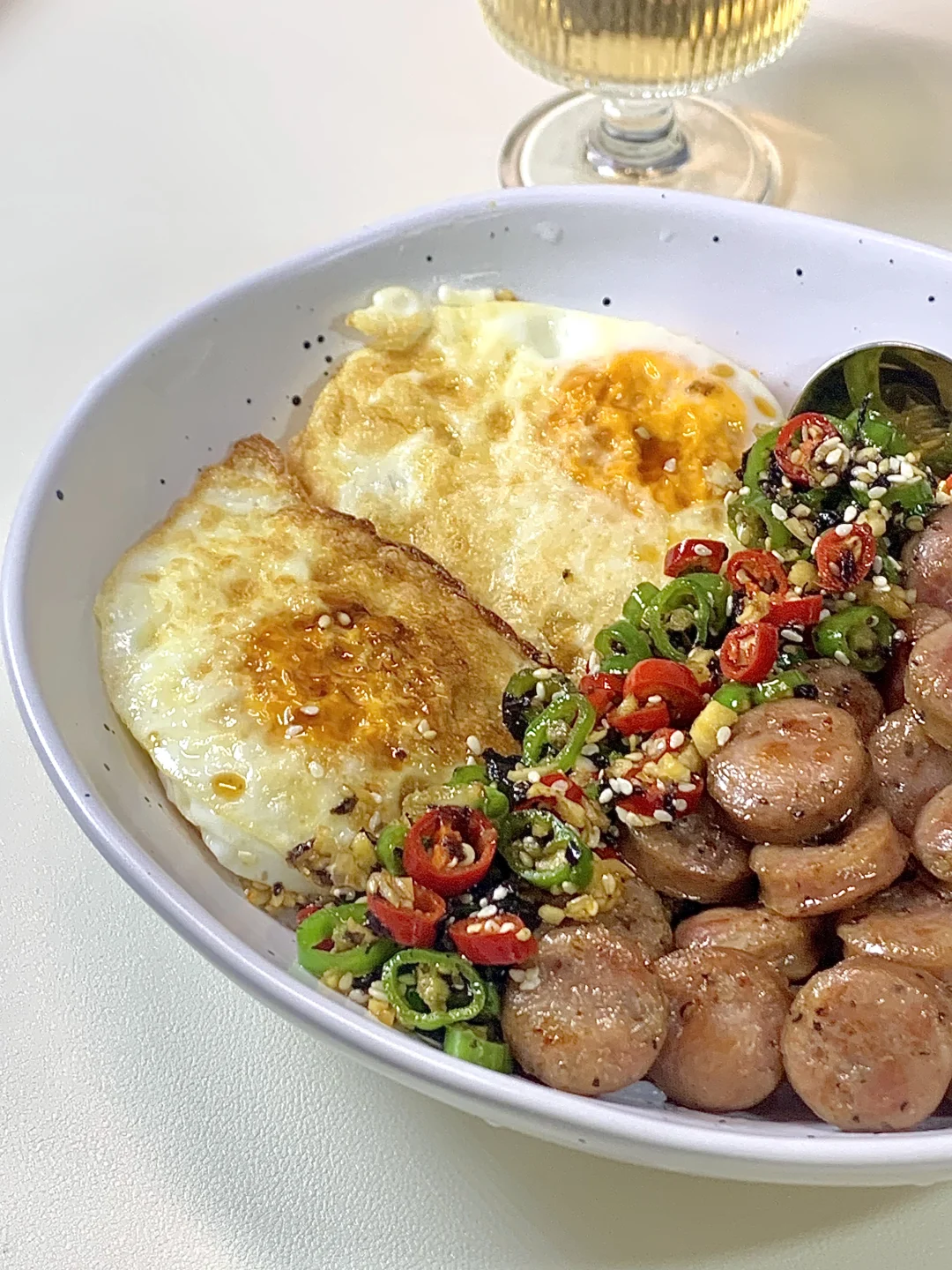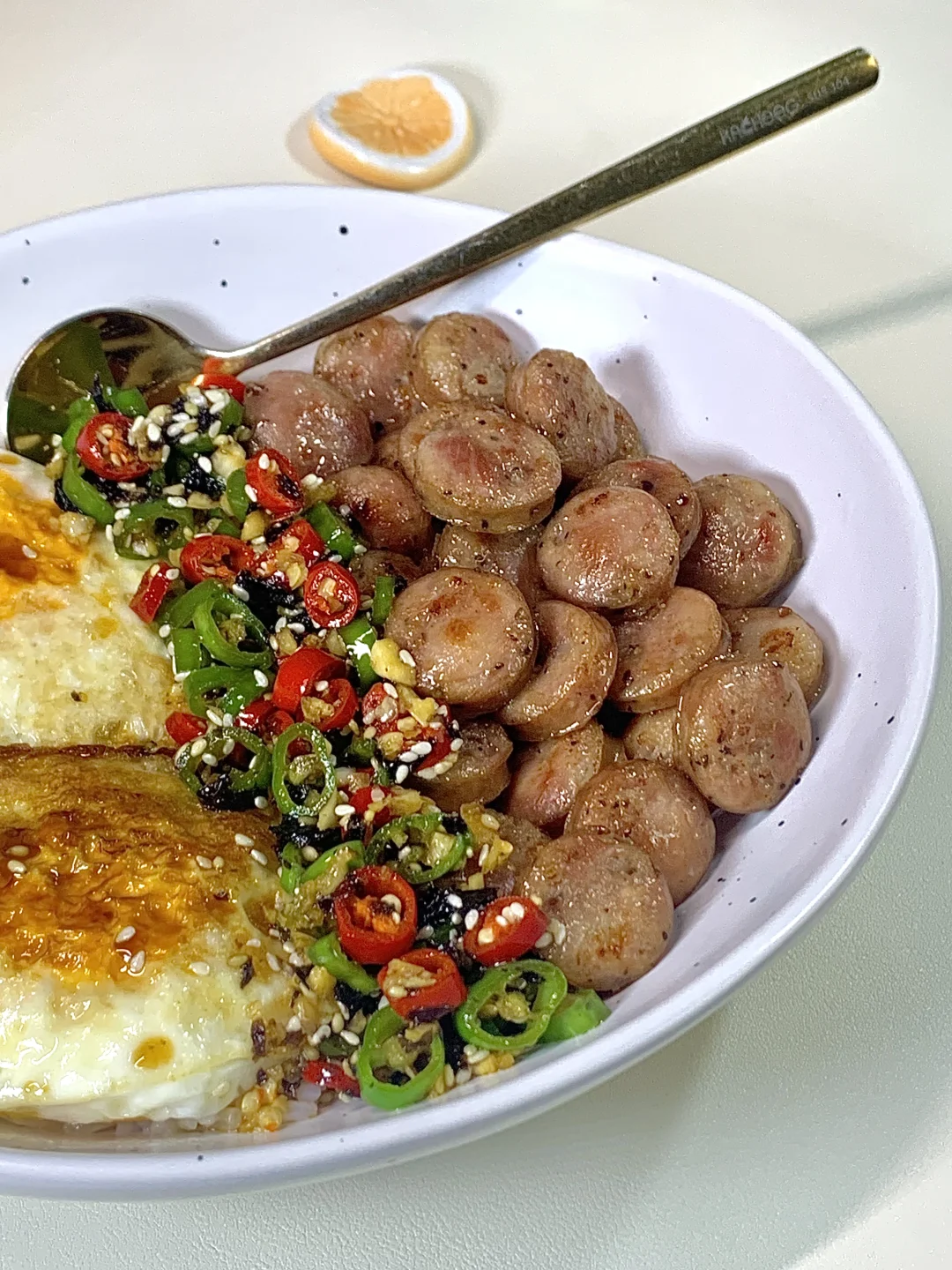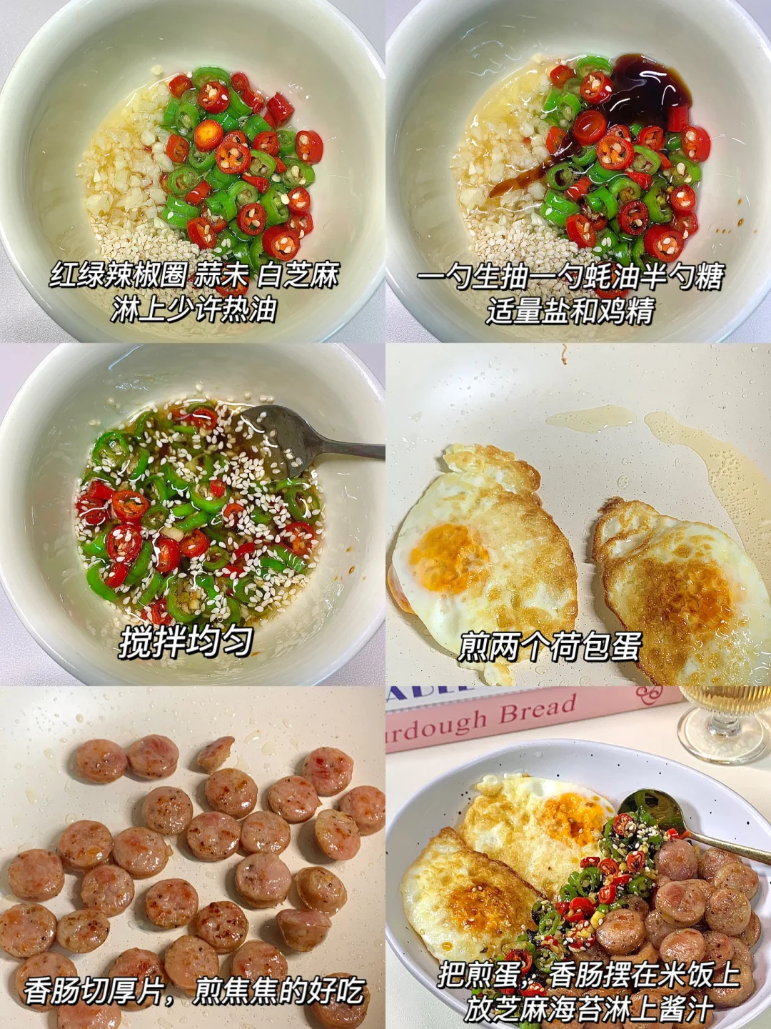[购物车R][购物车R][购物车R][购物车R][购物车R][购物车R] 准备食材:鸡蛋,香肠,少许米饭 1️⃣少许热油煎两个灵魂荷包蛋🍳 2️⃣底油放入香肠煎至微微焦巨香 3️⃣调个酱汁:(青红辣椒圈白芝麻淋上少许热油)一勺生抽一勺蚝油半勺糖拌匀即可 少许米饭放底下摆上鸡蛋香肠淋上酱汁拌匀即可开吃啦~真的真的巨好吃,姐妹们快去试试呀~