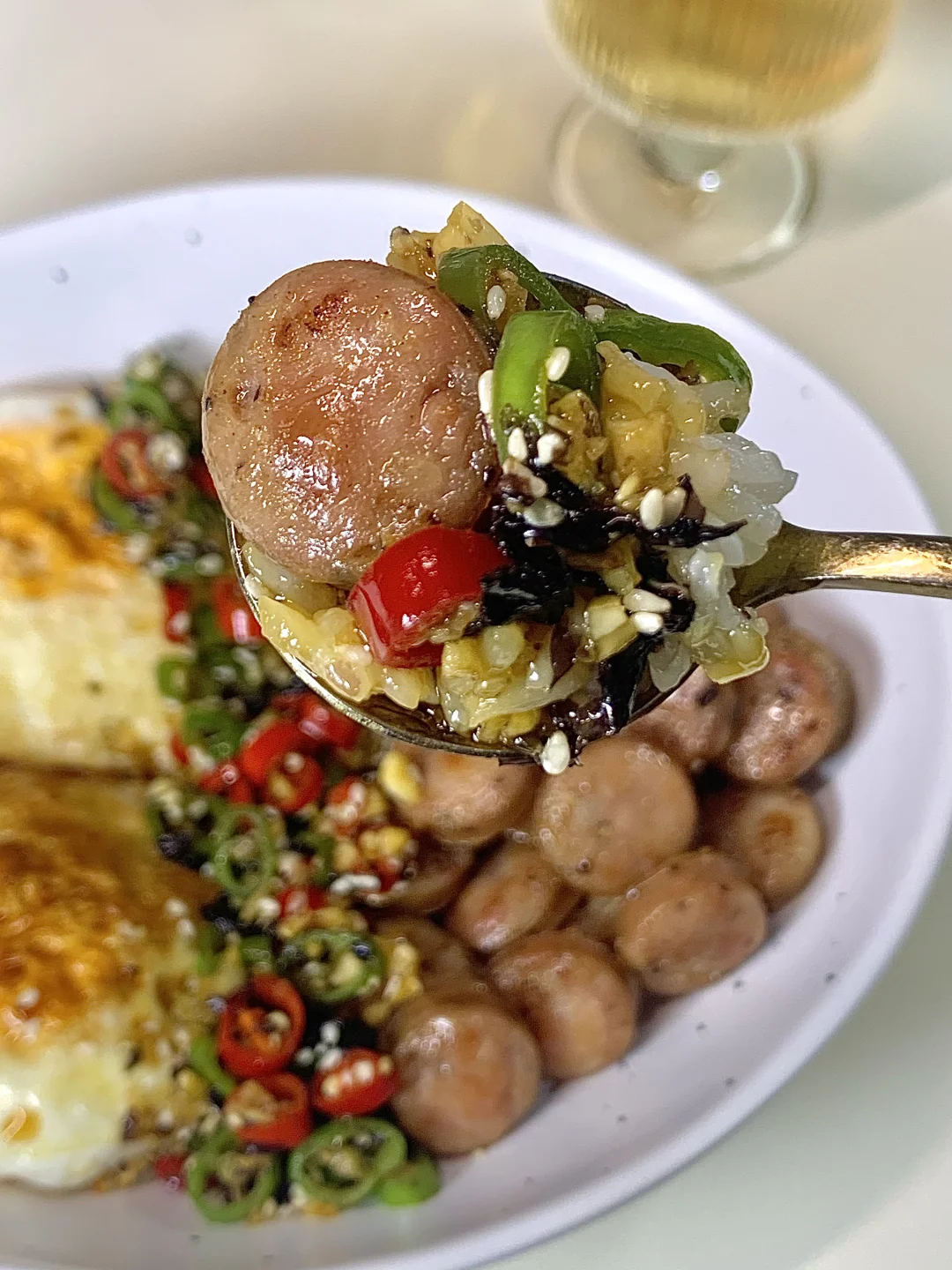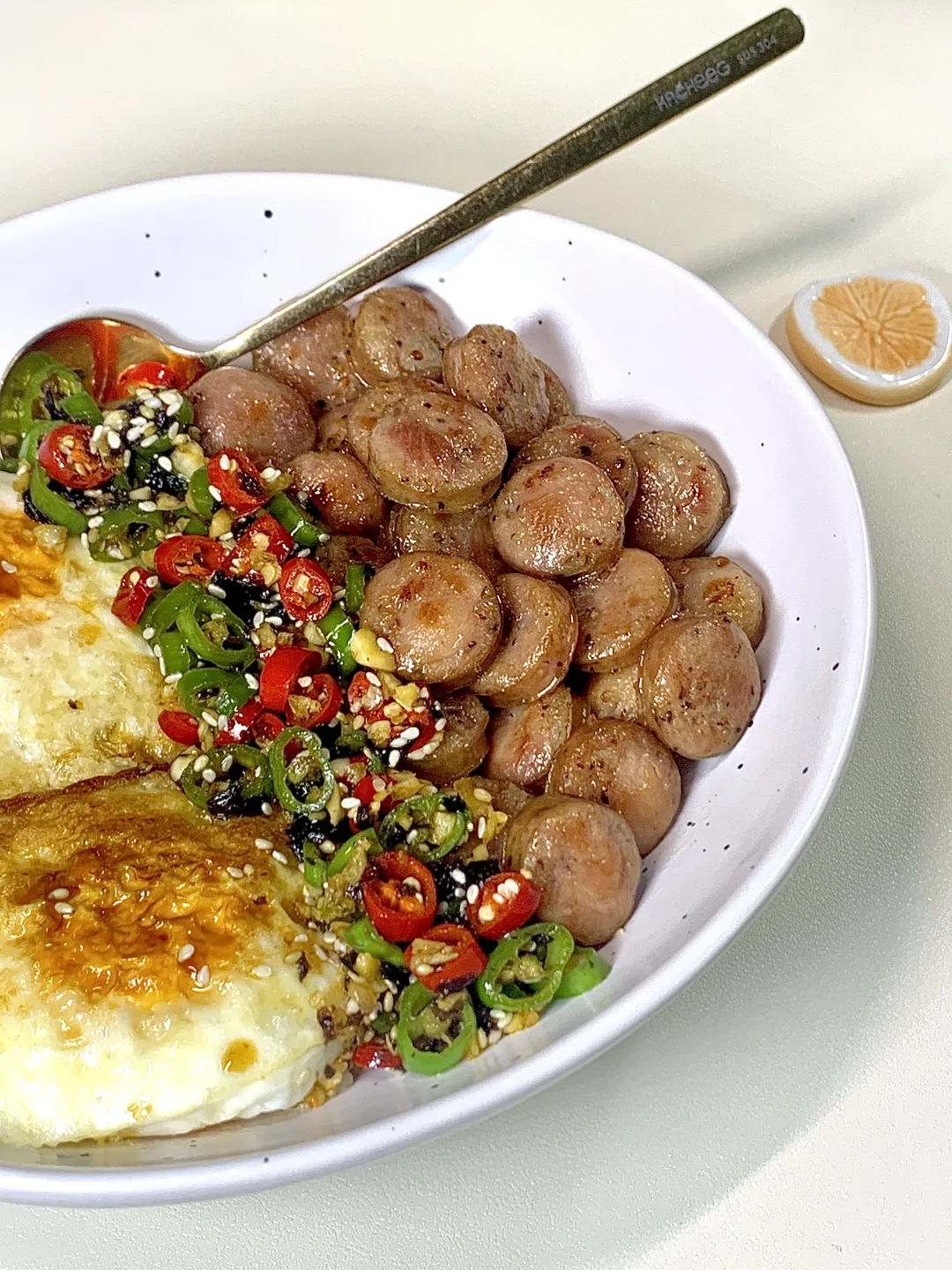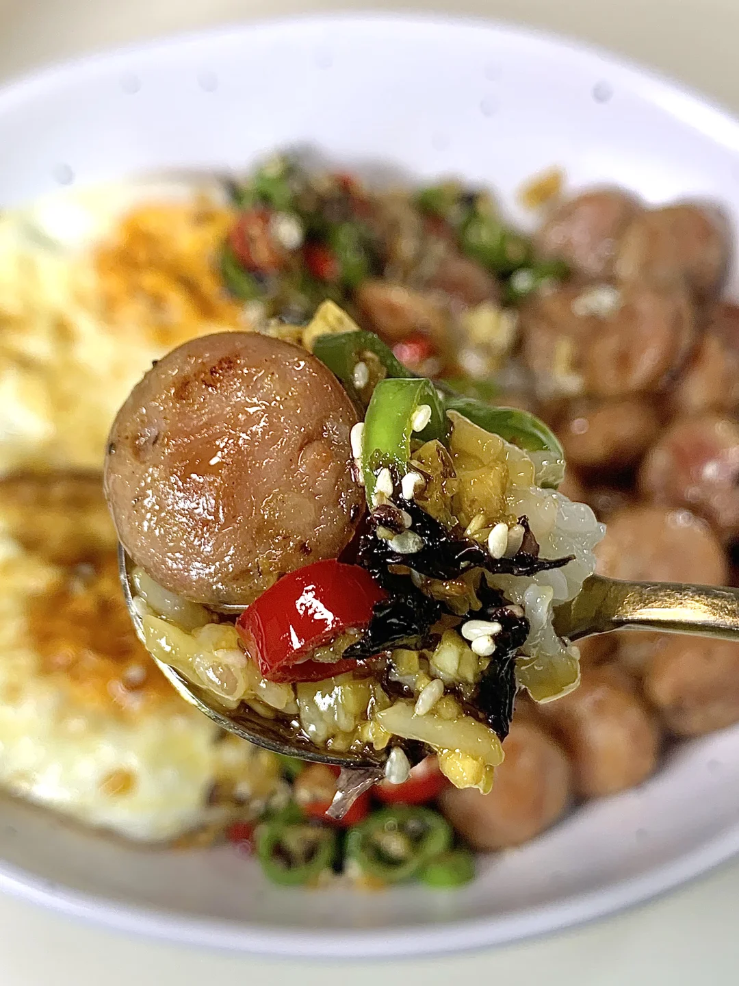 [购物车R][购物车R][购物车R][购物车R][购物车R][购物车R] 准备食材:鸡蛋,香肠,少许米饭 1️⃣少许热油煎两个灵魂荷包蛋🍳 2️⃣底油放入香肠煎至微微焦巨香 3️⃣调个酱汁:(青红辣椒圈白芝麻淋上少许热油)一勺生抽一勺蚝油半勺糖拌匀即可 少许米饭放底下摆上鸡蛋香肠淋上酱汁拌匀即可开吃啦~真的真的巨好吃,姐妹们快去试试呀~