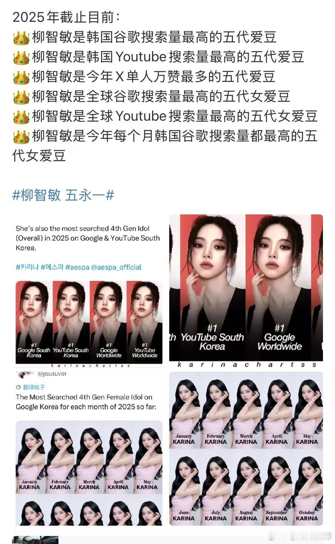 柳智敏成为2025年韩国Google、韩国YouTube、全球Google、全球YouTube搜索量均第1高的五代女爱豆,也是韩国Google、韩国Youtube搜索量最高、X单人万赞最多的五代爱豆📊