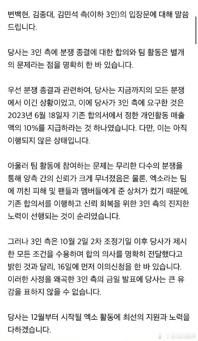 SM回应cbx声明 进展:SM回应cbx,cbx未按照合同支付个人活动销售额的10%,cbx通过大量无理诉讼破坏信任,给EXO造成损害,所谓接受所有条件是说谎。SM称cbx说谎