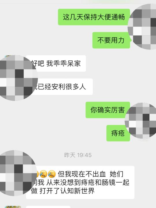 我一个许久未联系的朋友,经常痔疮出血,从另外一个找我做过痔疮手术的好朋友那里了解到我们做肠镜可以做痔疮手术。上周联系我来看了门诊约了肠镜检查,昨天给她肠镜做进去,果然内痔很严重,于是给她当场做了套扎手术,本来以为她肯定会有痛感,没想到她说昨天今天都没感觉[笑哭R],还说打开了认知新世界,做个肠镜竟然把痔疮也做了…本来一直觉得做痔疮手术是个特别恐怖的事情。