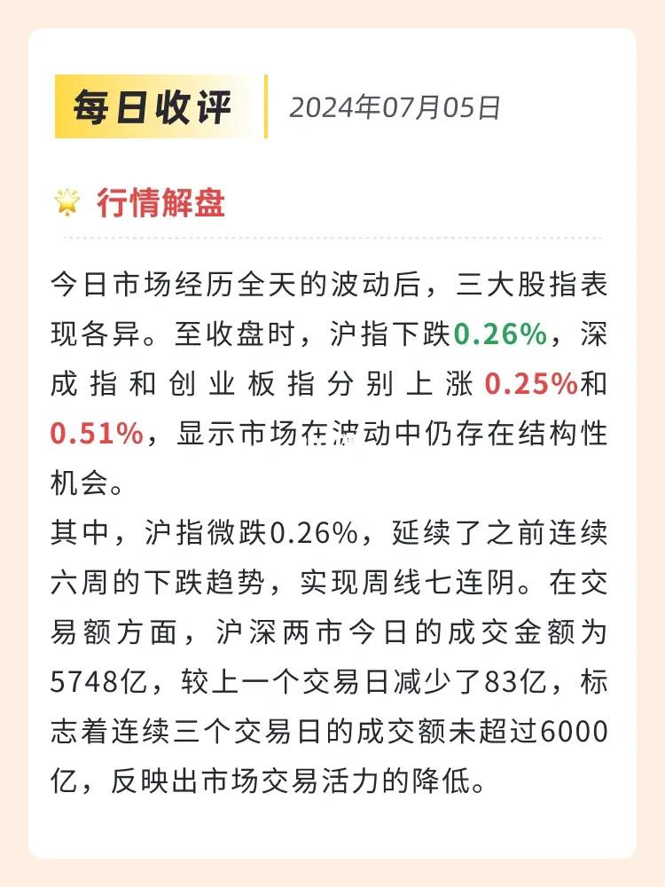 👉其中,沪指微跌0.26%,延续了之前连续六周的下跌趋势,实现周线七连阴。在交易额方面,沪深两市今日的成交金额为5748亿,较上一个交易日减少了83亿,标志着连续三个交易日的成交额未超过6000亿,反映出市场交易活力的降低。