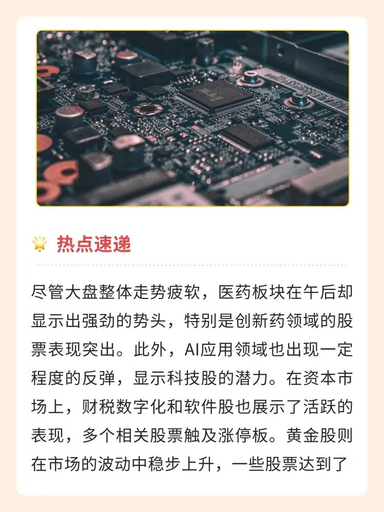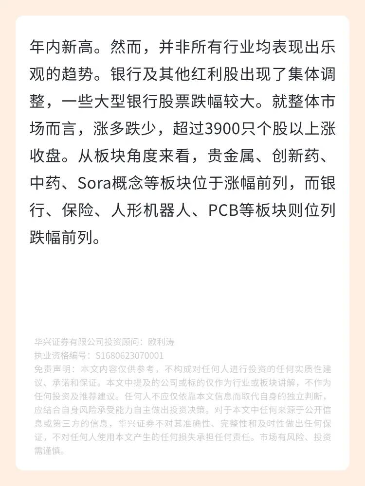 👉尽管大盘整体走势疲软,医药板块在午后却显示出强劲的势头,特别是创新药领域的股票表现突出。此外,AI应用领域也出现一定程度的反弹,显示科技股的潜力。在资本市场上,财税数字化和软件股也展示了活跃的表现,多个相关股票触及涨停板。黄金股则在市场的波动中稳步上升,一些股票达到了年内新高。然而,并非所有行业均表现出乐观的趋势。银行及其他红利股出现了集体调整,一些大型银行股票跌幅较大。就整体市场而言,涨多跌少,超过3900只个股以上涨收盘。从板块角度来看,贵金属、创新药、中药、Sora概念等板块位于涨幅前列,而银行、保险、人形机器人、PCB等板块则位列跌幅前列。
