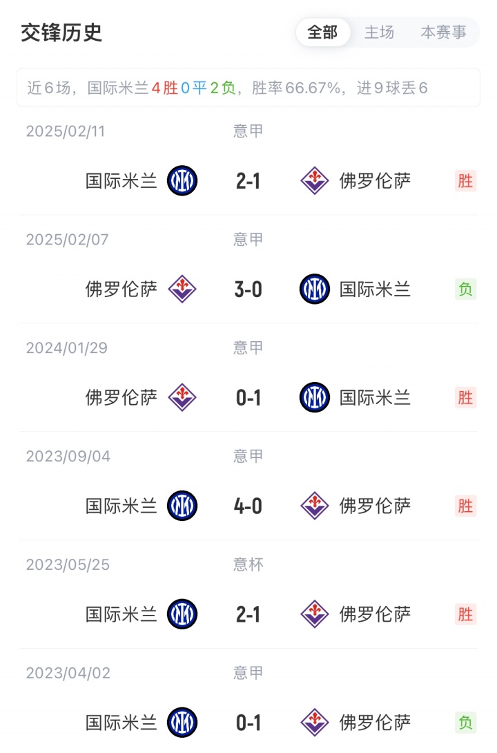 国米联赛5胜3负积15分,上轮客场1-3不敌那不勒斯,终结联赛4连胜;佛罗伦萨开局8轮不胜积4分。国米主场对阵佛罗伦萨已3连胜。