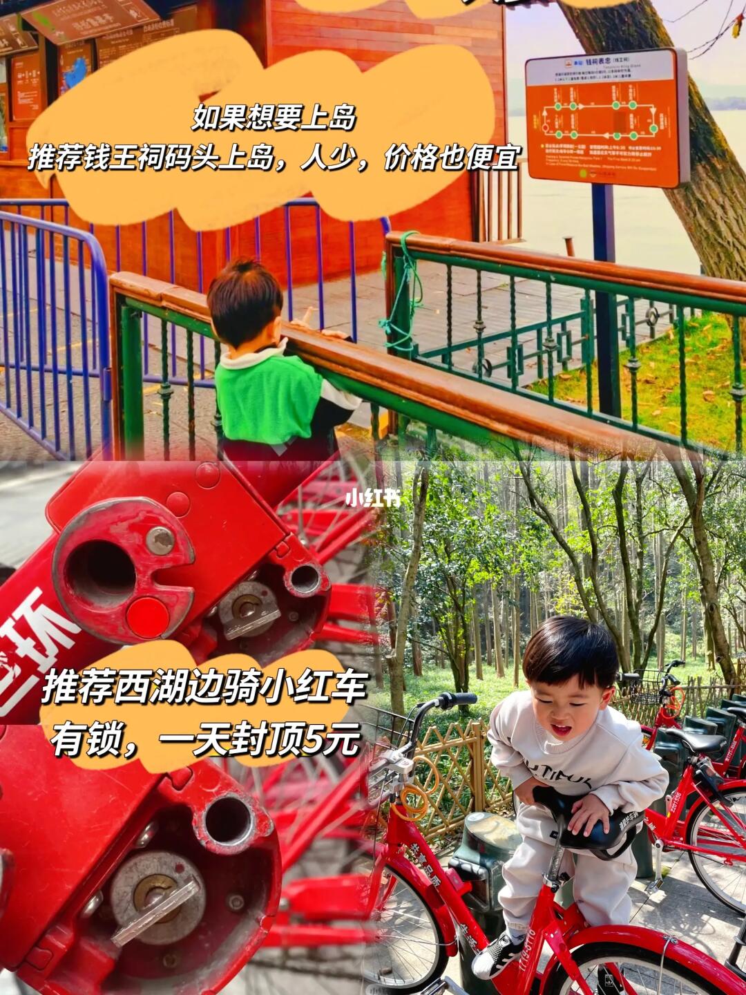 📍西湖边打车巨难打,推荐小红车,一天封顶5元,还有锁,不用担心被骑走,部分小红车有亲子位,适合带娃的家庭