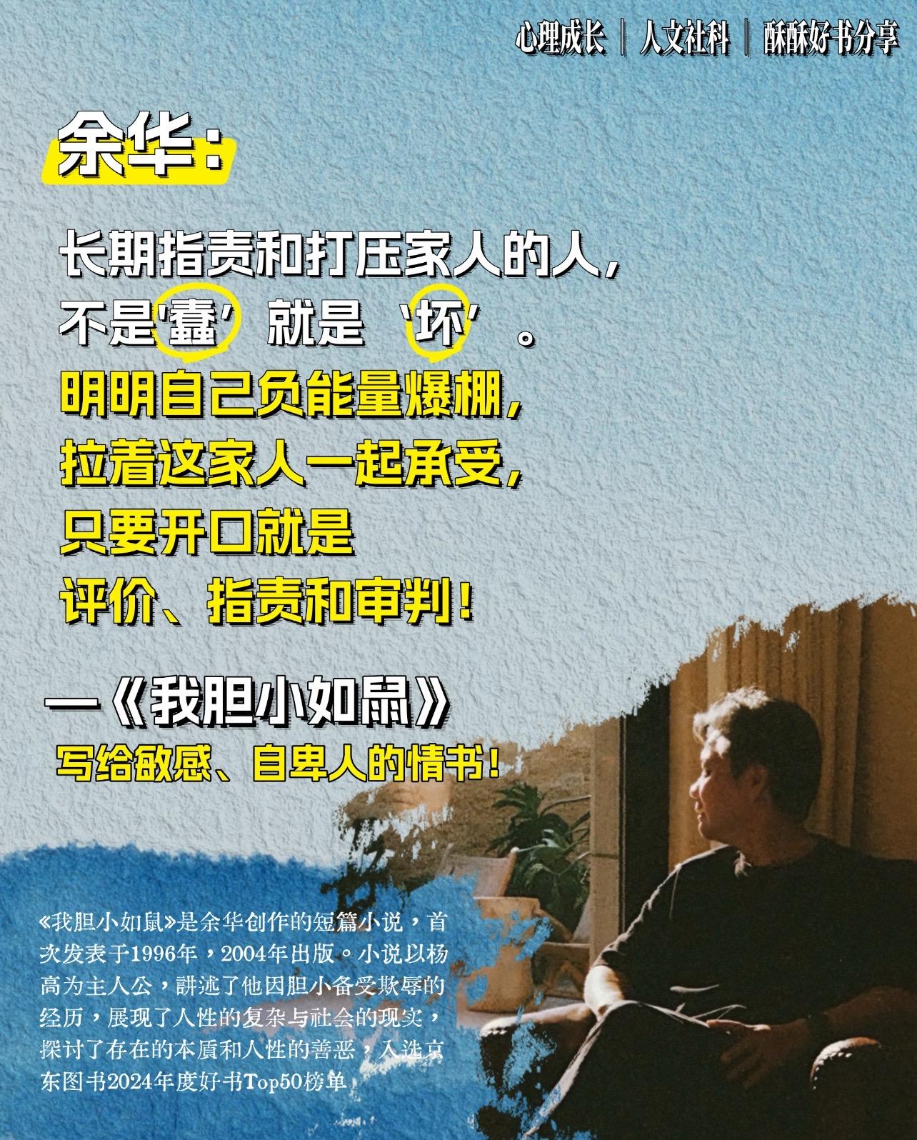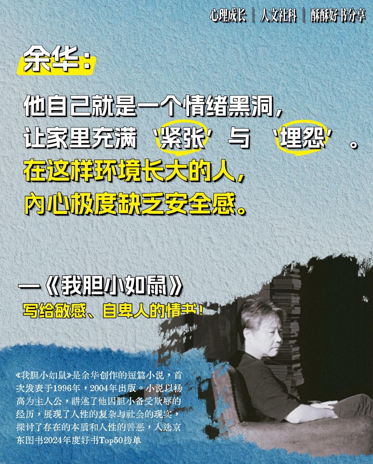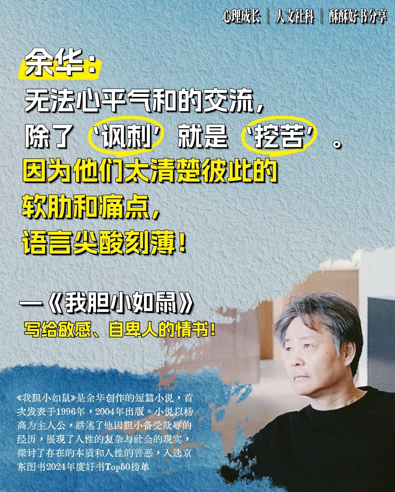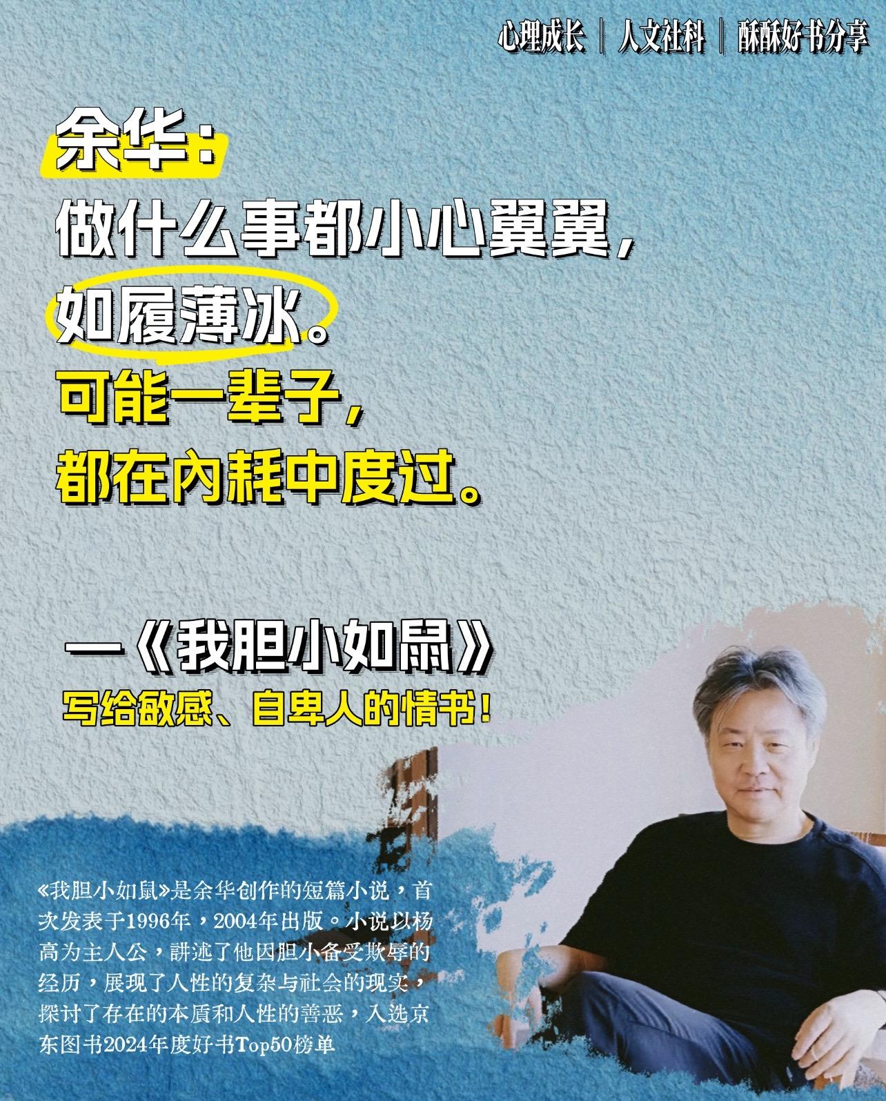 胆小者必看:在余华笔下,看见藏不住的自己。如果你总被胆小裹挟,总在怯懦里挣扎,今天一定要翻开余华的《我胆小如鼠》。 “我的心脏都快被恐惧挤破了”——没有华丽修饰,只有直白如刀的文字,一刹那就划开伪装的心房。余华以荒诞笔触剖开人性褶皱里的幽微,让你在主人公的怯懦与不安里,清晰照见自己内心深处那个不敢示人的隐秘角落,每一页都戳中软肋,每一句都引发生理级的共情。