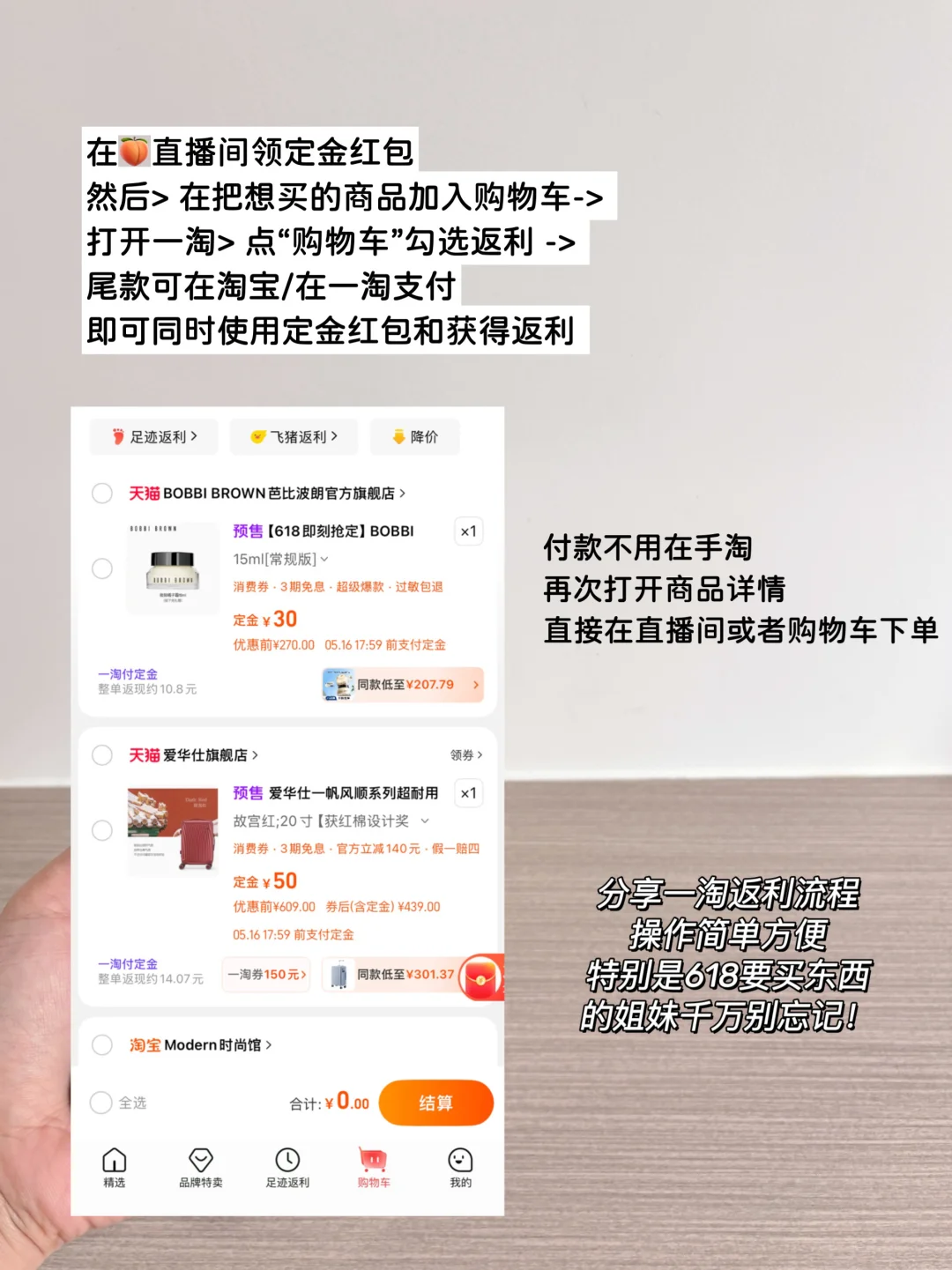 然后-> 把想买的商品加入🛒-> 打开一淘> 在“购物车”勾选返利 -> 回到手淘付定> 尾款可在淘宝/在一淘付,就能使用定金红包获得返利