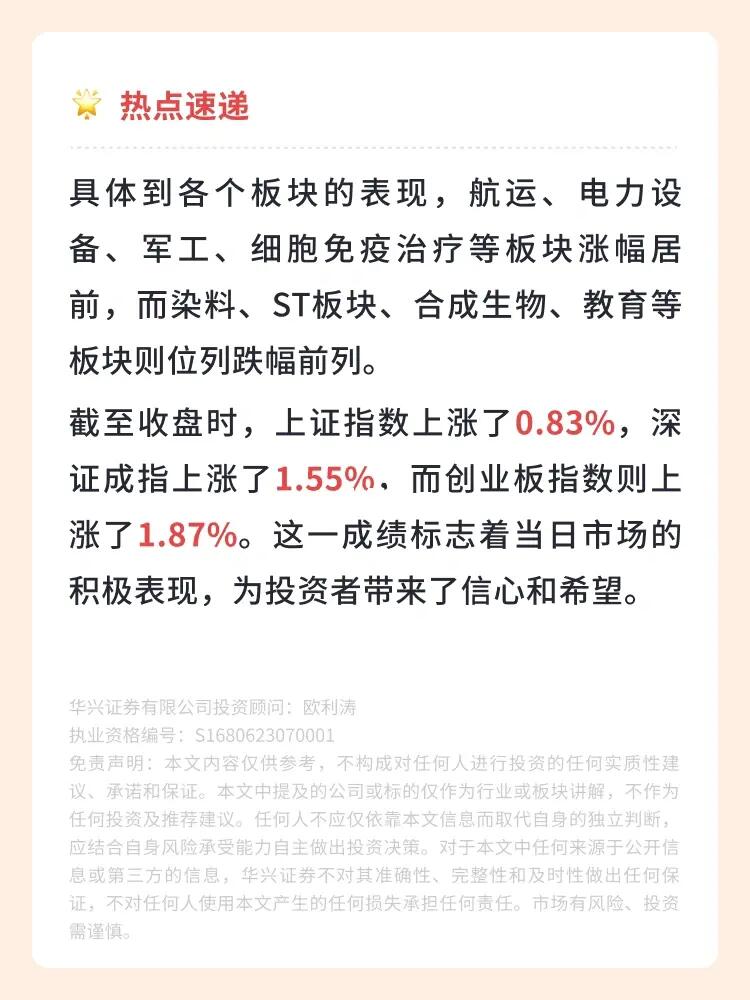 👉 截至收盘时,上证指数上涨了0.83%,深证成指上涨了1.55%,而创业板指数则上涨了1.87%。这一成绩标志着当日市场的积极表现,为投资者带来了信心和希望。