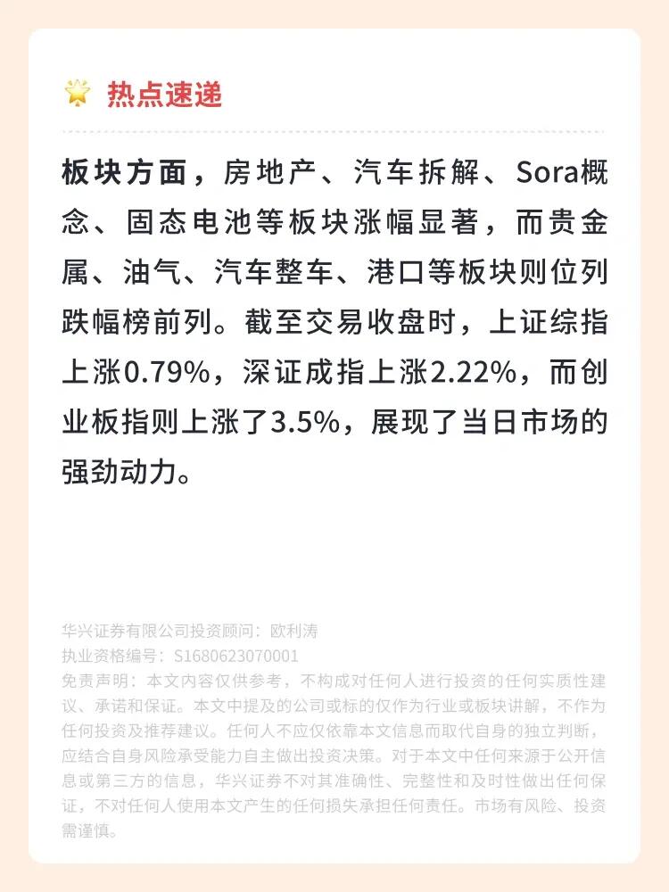 👉 板块方面,房地产、汽车拆解、Sora概念、固态电池等板块涨幅显著,而贵金属、油气、汽车整车、港口等板块则位列跌幅榜前列。截至交易收盘时,上证综指上涨0.79%,深证成指上涨2.22%,而创业板指则上涨了3.5%,展现了当日市场的强劲动力。