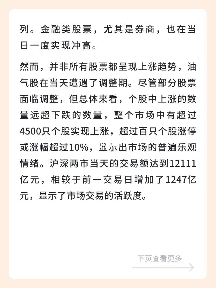 👉 然而,并非所有股票都呈现上涨趋势,油气股在当天遭遇了调整期。尽管部分股票面临调整,但总体来看,个股中上涨的数量远超下跌的数量,整个市场中有超过4500只个股实现上涨,超过百只个股涨停或涨幅超过10%,显示出市场的普遍乐观情绪。沪深两市当天的交易额达到12111亿元,相较于前一交易日增加了1247亿元,显示了市场交易的活跃度。