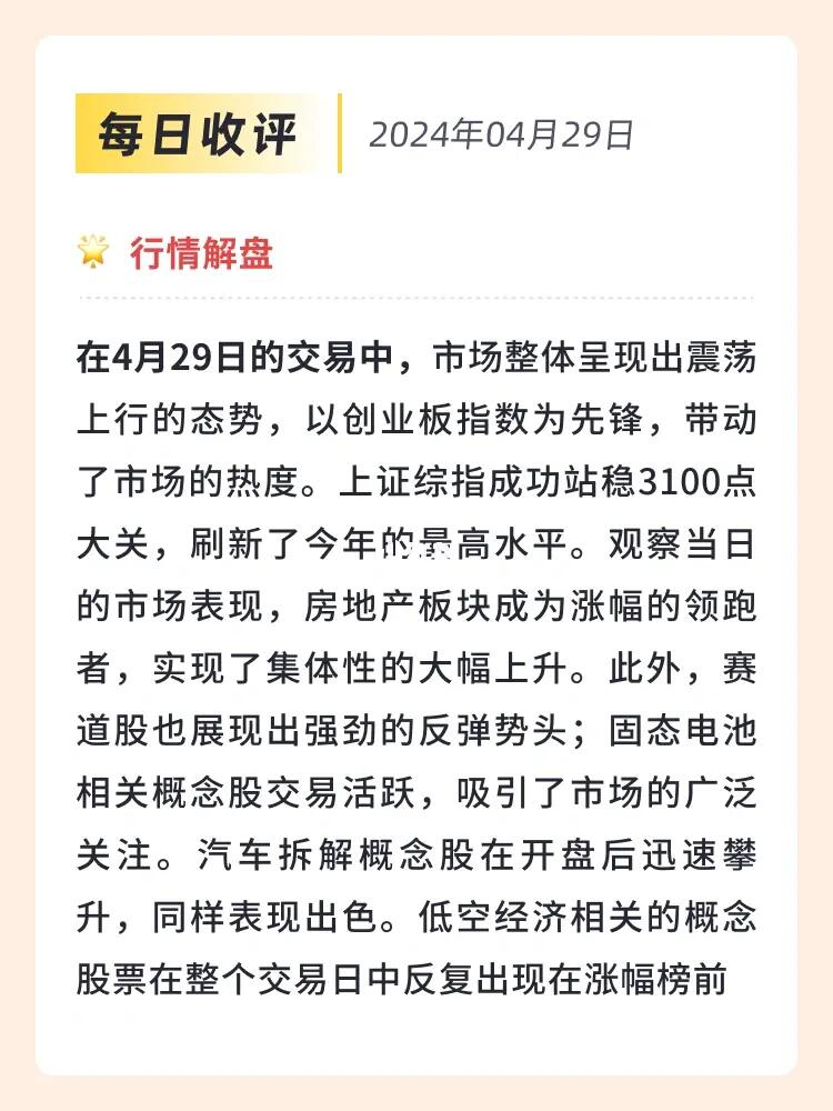 👉 在4月29日的交易中,市场整体呈现出震荡上行的态势,以创业板指数为先锋,带动了市场的热度。上证综指成功站稳3100点大关,刷新了今年的最高水平。观察当日的市场表现,房地产板块成为涨幅的领跑者,实现了集体性的大幅上升。此外,赛道股也展现出强劲的反弹势头;固态电池相关概念股交易活跃,吸引了市场的广泛关注。汽车拆解概念股在开盘后迅速攀升,同样表现出色。低空经济相关的概念股票在整个交易日中反复出现在涨幅榜前列。金融类股票,尤其是券商,也在当日一度实现冲高。