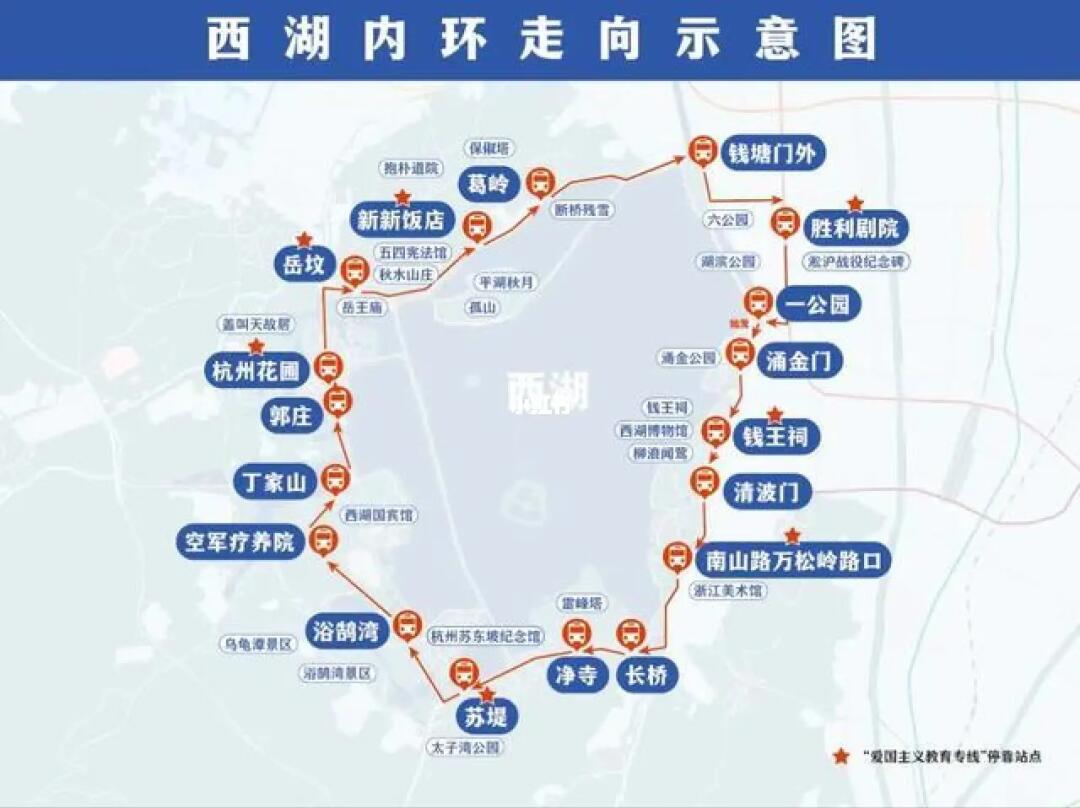 岳坟(岳王庙)、杭州花圃、郭庄、丁家山(茅家埠)、空军疗养院、浴鹄湾、苏堤(杭州苏东坡纪念馆)、净寺(雷峰塔)、长桥、南山路万松岭路口(浙江美术馆)、清波门、钱王祠(杭州西湖博物馆)、饮马井巷、胜利剧院(淞沪战役纪念碑)、钱塘门外、少年宫、新新饭店(五四宪法馆·北山街馆区)、葛岭(断桥残雪)、西泠桥(孤山)