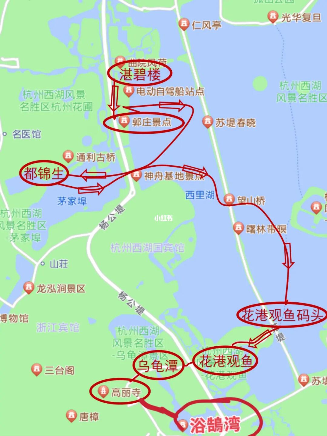 [向右R]路线:曲院风荷湛碧楼-郭庄 -曲院风荷4号门中美友谊井(6元坐西湖环湖公交船, 茅家埠下船)