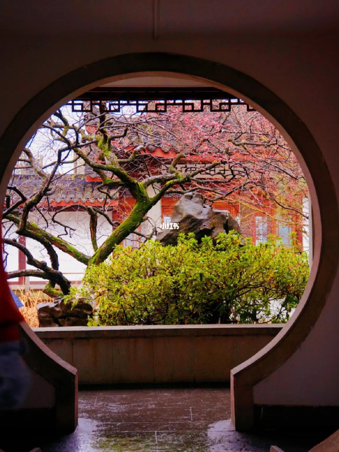 西湖边我最爱的园林,满月门洞,特别美,梅花开了一部分了