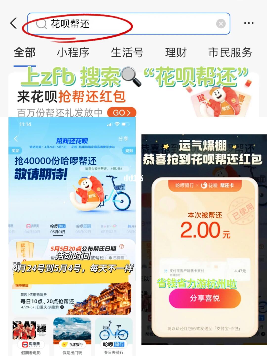 最近有🌸呗的帮 还活动,5月1/2号是哈 啰的帮 还日,用哈 啰 A P P 骑车,选择花 呗消费,10:00、20:00上支 付 宝搜花 呗 帮 还能抢帮 还红包,一共40000个红 包,省钱省力游杭州