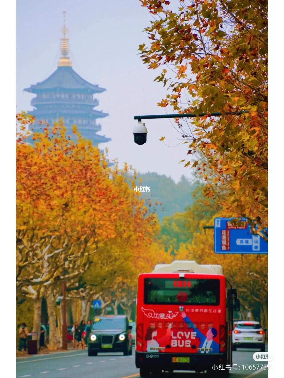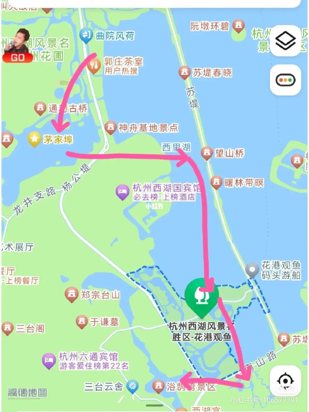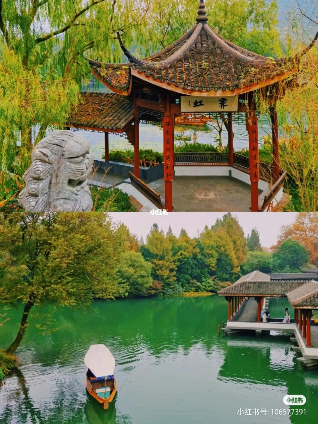 曲院风荷坐6元公交船-到茅家埠(徒步,赏景)-坐8元西湖游船到花港观鱼(徒步游花港观鱼,喂鸳鸯,看红枫)-太子湾公园-浴鹄湾