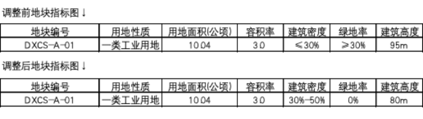 根据公示信息,该地块名为“高新区350121-DXCS-A管理单元A-01地块”,工地用地性质并未作出调整,仍为一类工业用地,用地面积10.04公顷,容积率3.0,而建筑密度由原来的≤30%,调整为30%-50%,绿地率降为0%,建筑高度亦从95米下调至80米。