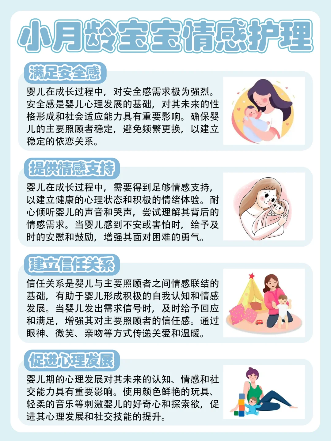 婴儿对an全感需求极为强烈,确保婴儿的主要照顾者稳定,避免频繁更换,以建立稳定的依恋关系