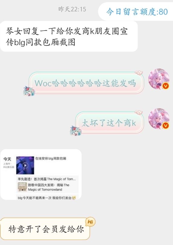 直播吧10月30日讯昨日博主“琴女你怎么骂人啊”转发BLG商K事件的相关爆料内容,今日博主更新动态分享,有粉丝私信分享:商K发朋友圈宣传BLG同款包厢截图。